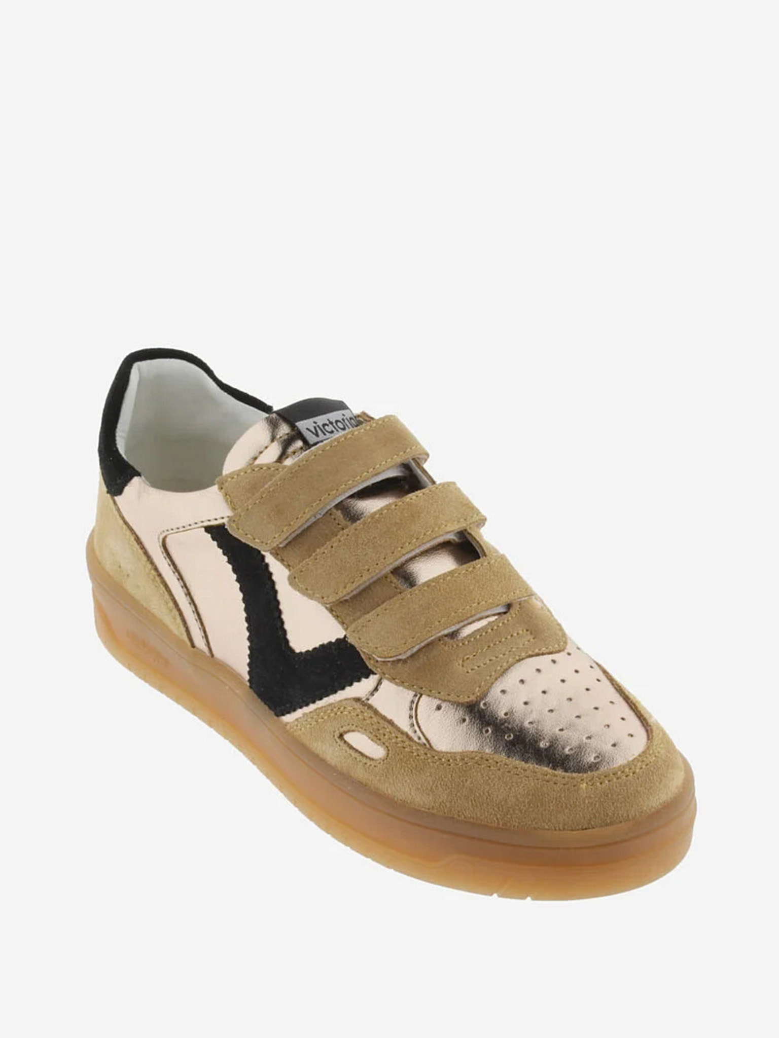Victoria-Sneaker sind seit Jahrzehnten beliebt für ihre hochwertigen Materialien, trendigen Designs und die perfekte Passform. Der Seul Strap ist ein Low-Cut-Modell, ideal als flacher Damen-Sneaker, und besticht durch die stilvolle Kombination aus glänzender Bronze, weichen Wildleder-Overlays und kontrastierenden schwarzen V-Akzenten an den Seiten. Die transparente Chunky-Sohle verleiht dem Sneaker einen modernen, modischen Look, während die Farbgebung warm und vielseitig bleibt.