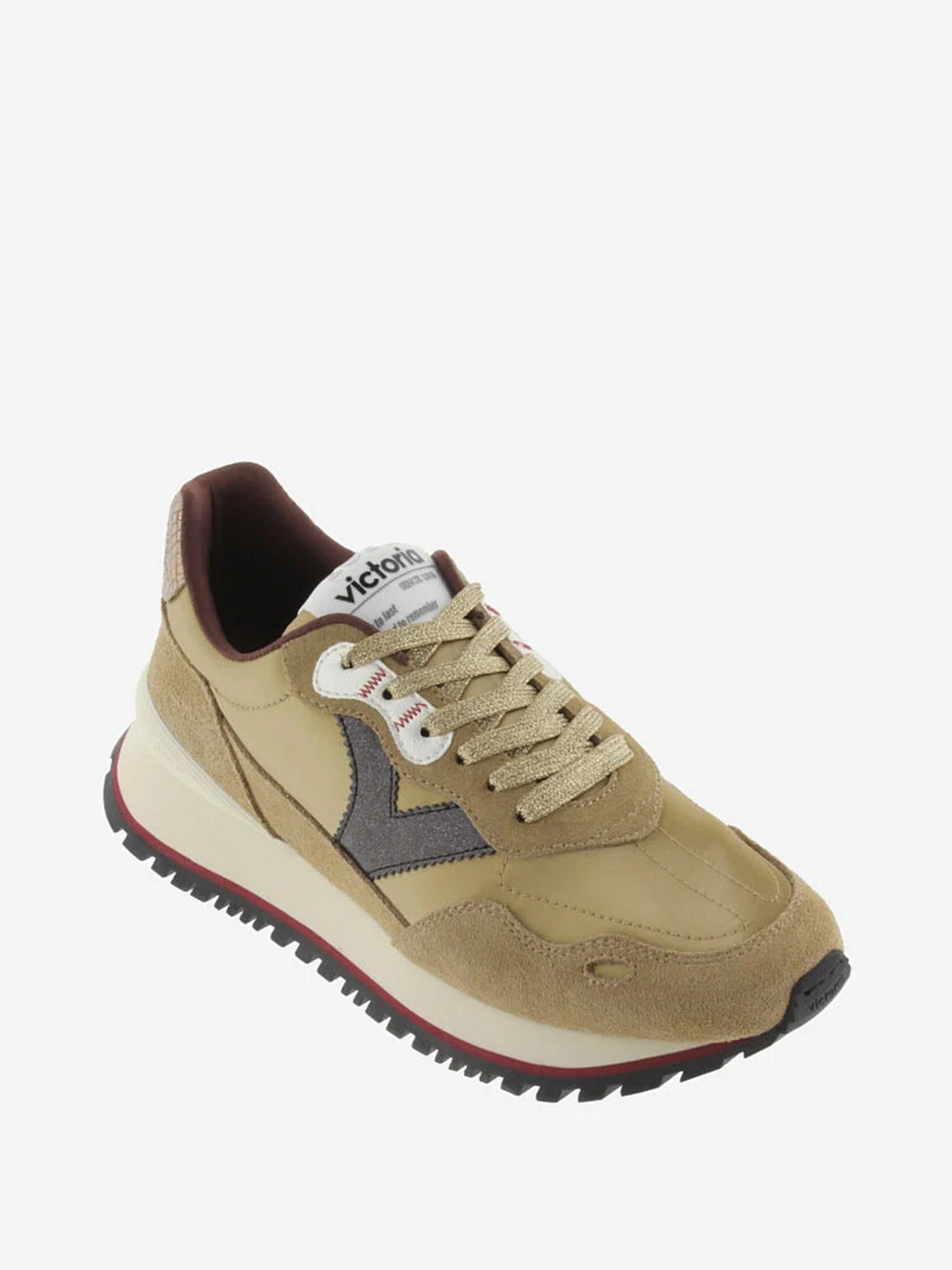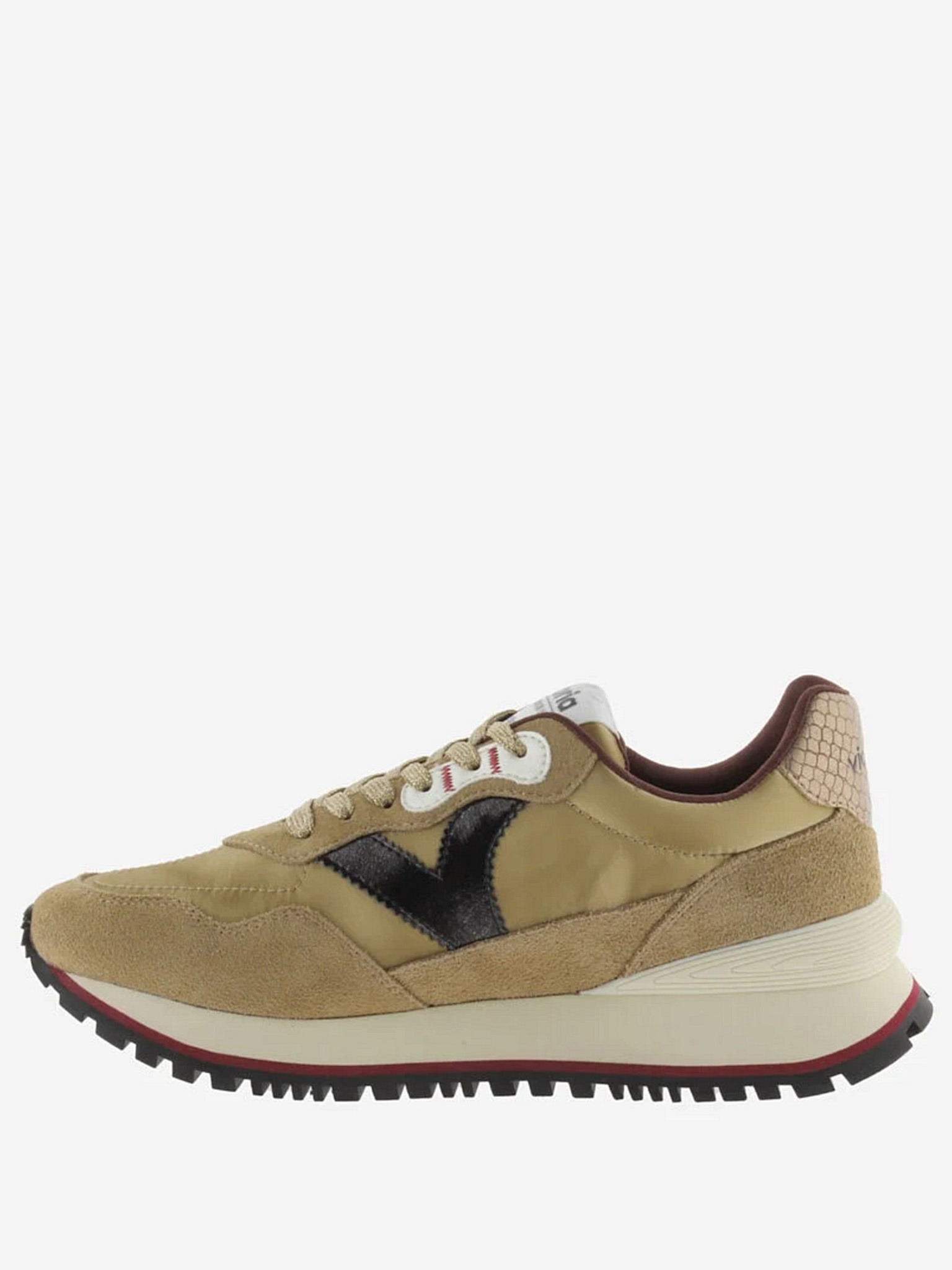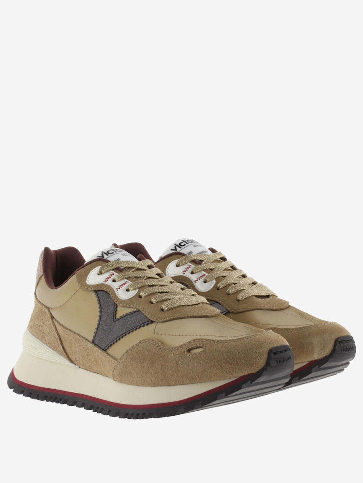 Die Sneaker von Victoria sind bekannt für ihre modernen Designs und hochwertigen Materialien. Dieses Modell ist aus goldfarbenem Nylon und Wildleder gefertigt und mit schwarzen V-Akzenten an den Seiten versehen. Die Kombination aus metallischem Glanz und weichen Materialien verleiht dem Schuh einen trendigen Look, während die sportlichen Linien für eine moderne Ausstrahlung sorgen.