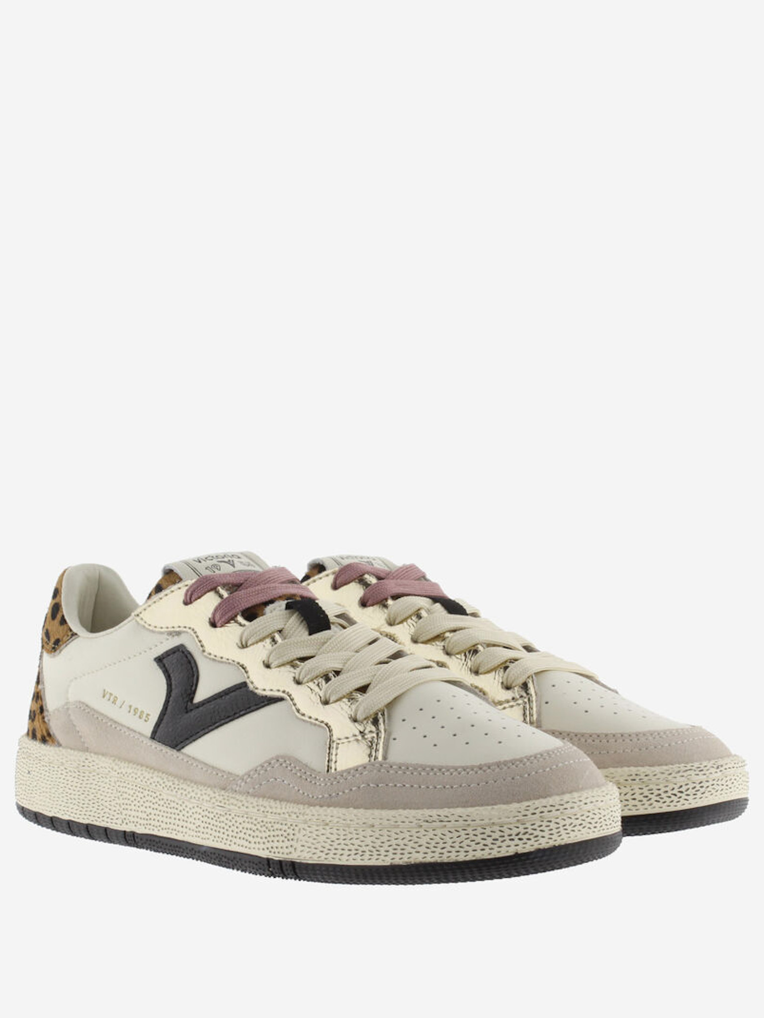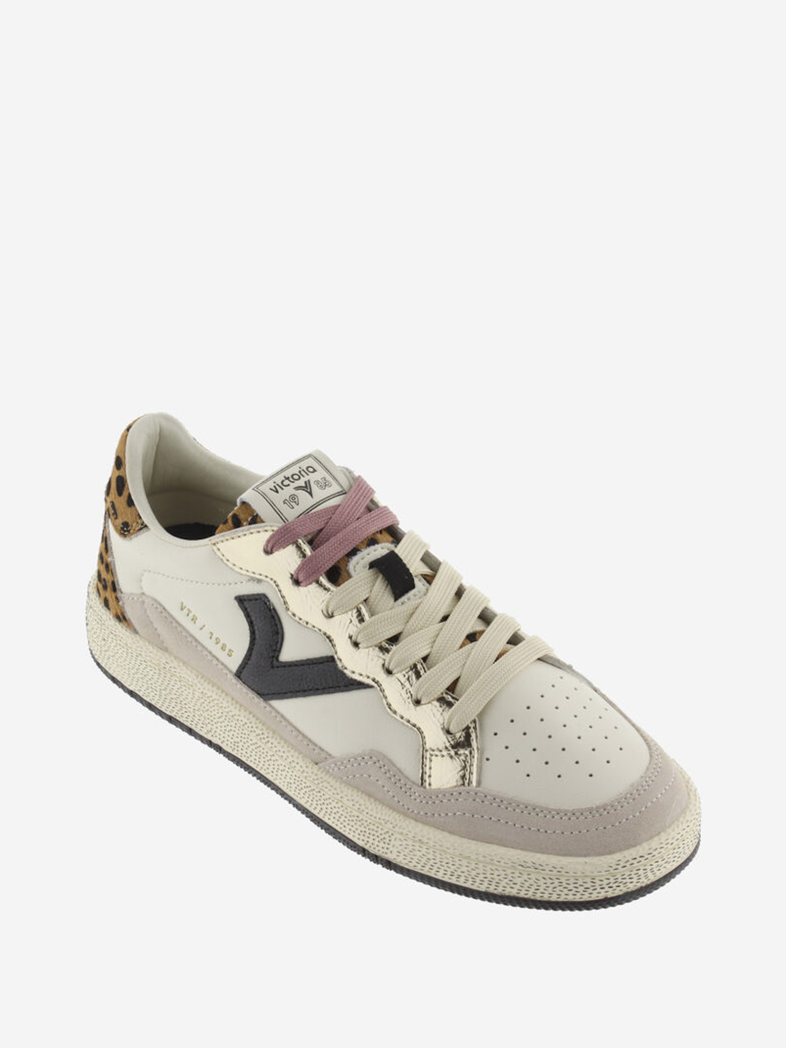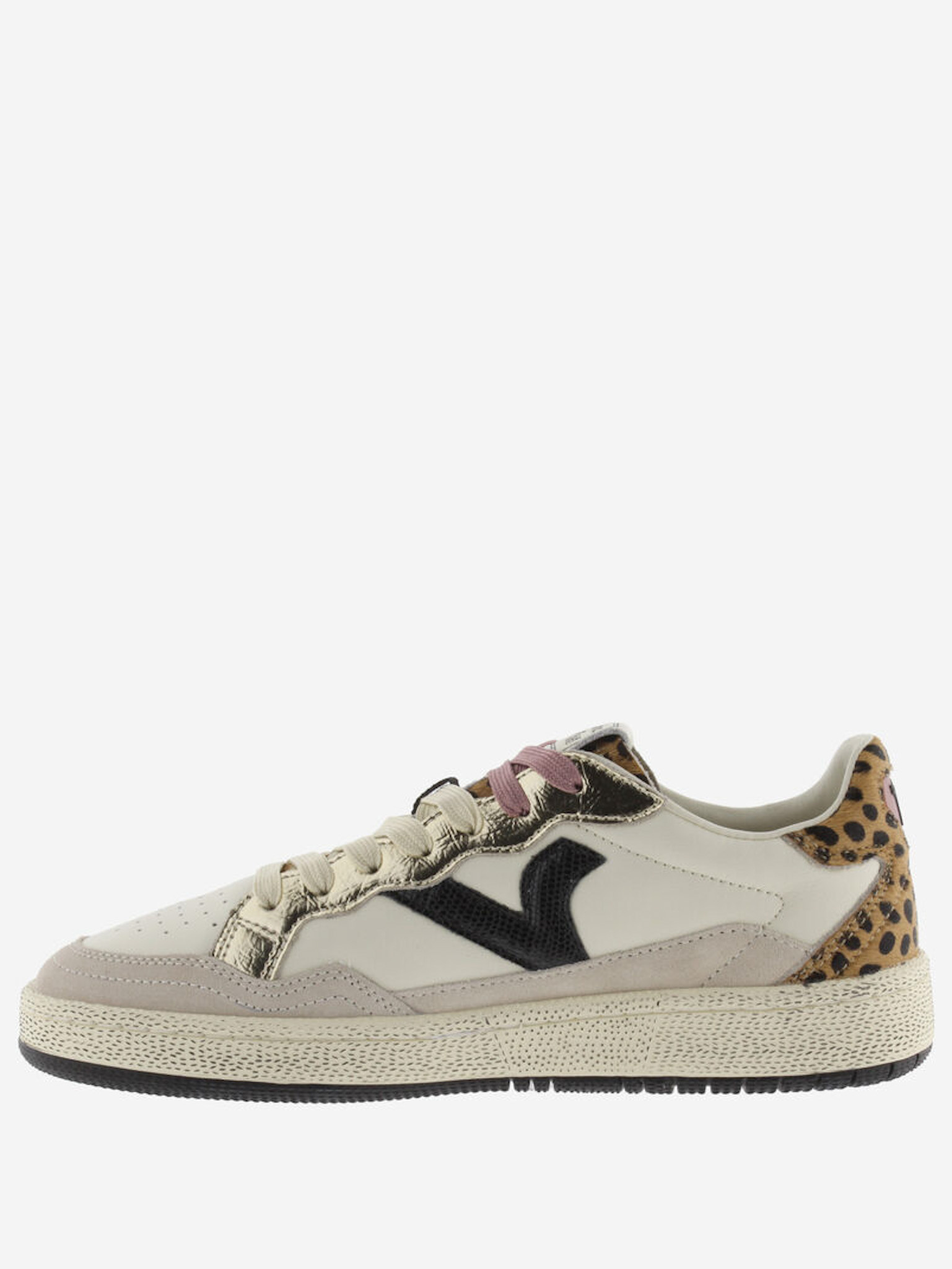 Der Smash von Victoria ist für Frauen entworfen, die moderne Sneaker mit einem einzigartigen Look lieben. Dank der frischen cremefarbenen Basis erhalten diese Schuhe eine zeitlose Optik, während das kontrastierende schwarze "V" und das Leoparden-Detail für einen auffälligen Twist sorgen. Die robuste Gummisohle und das weiche Innenfutter machen die Sneaker ideal für den ganzen Tag.