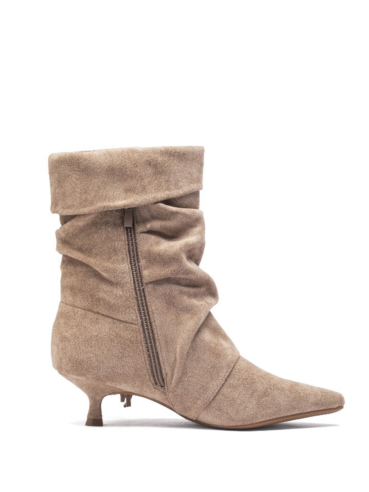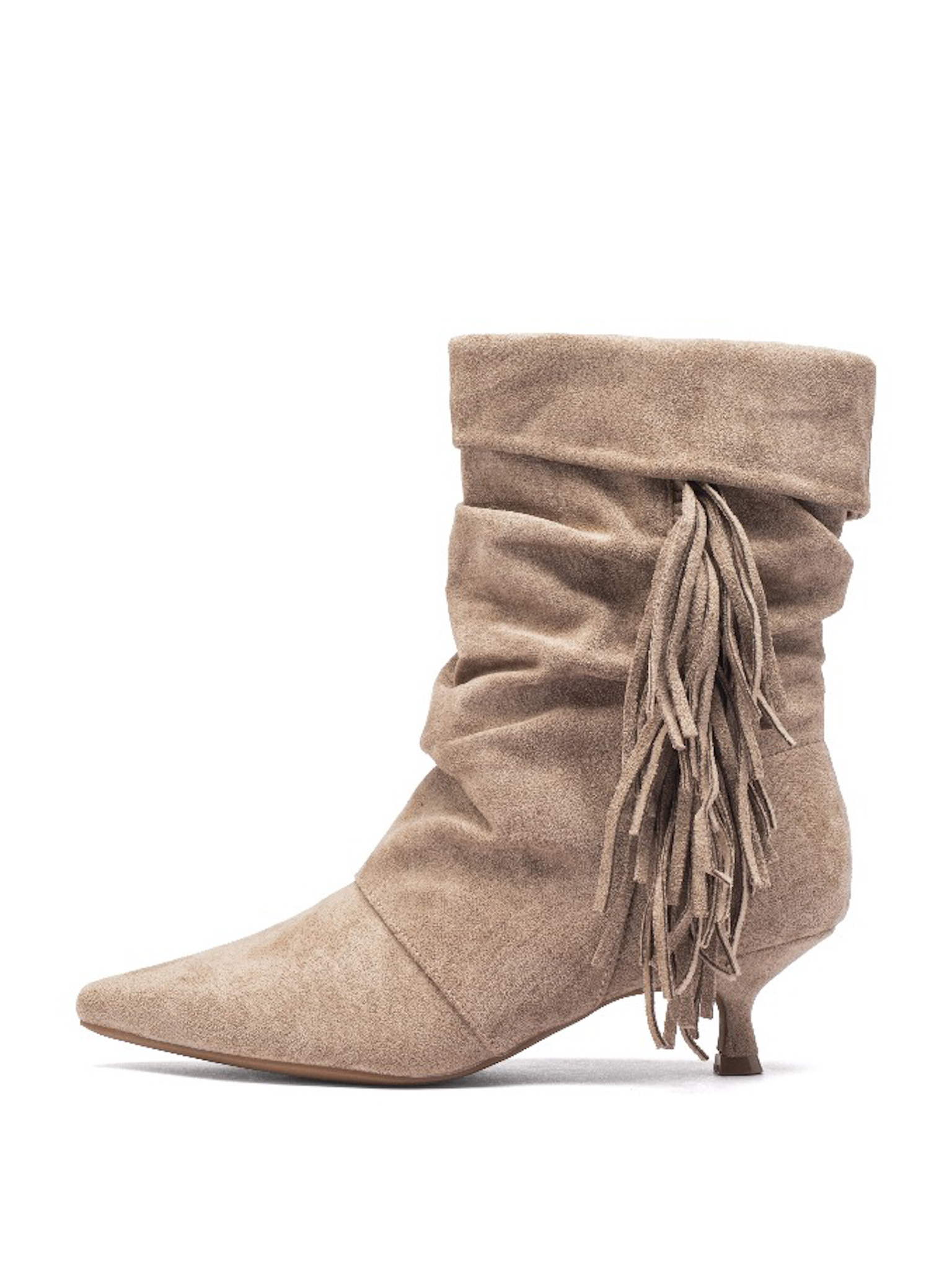 Stiefeletten gehören zu den vielseitigsten Schuhen, die man besitzen kann. Dieses Modell in warmem Khaki-Suedine ist stilvoll, trendig und zugleich zeitlos. Die Fransen an der Seite verleihen den Boots eine verspielte Note, während die spitze Form und der elegante Absatz für einen femininen und raffinierten Look sorgen.