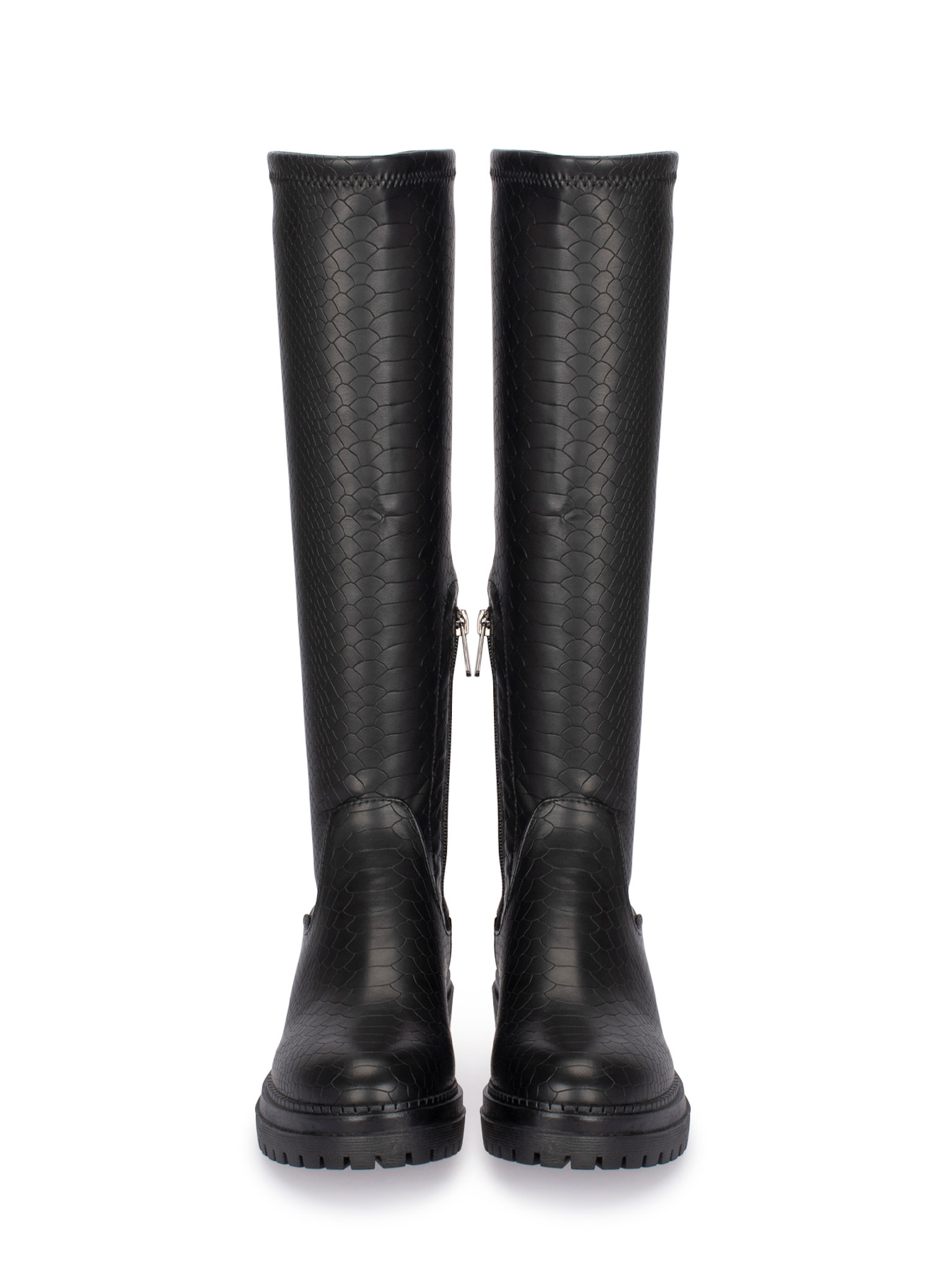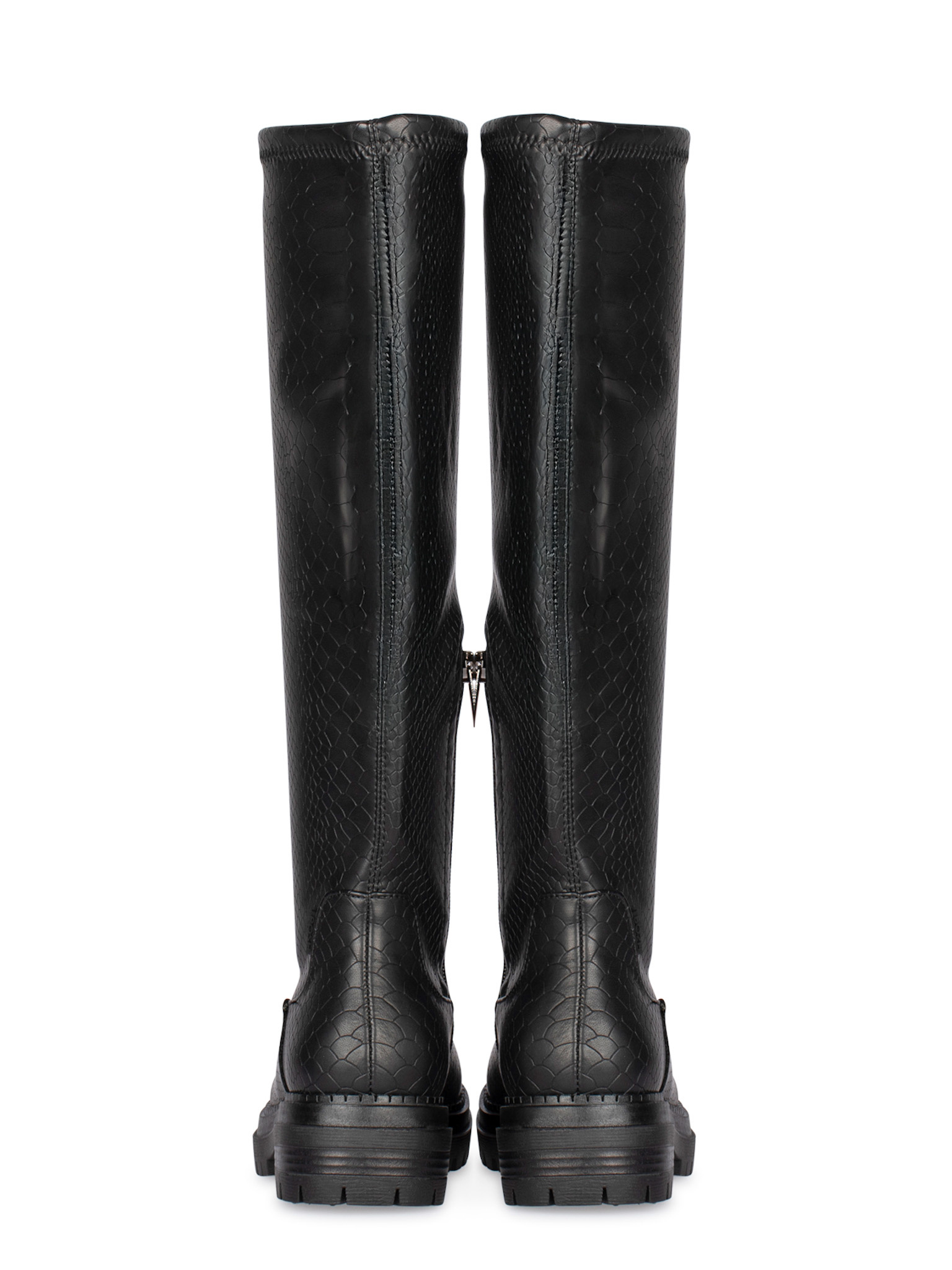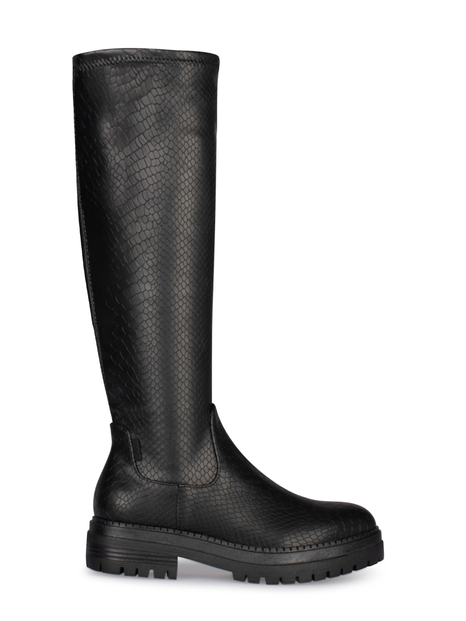 Diese hohen schwarzen Damenstiefel sind aus Kunstleder mit zarter Schlangenstruktur gefertigt. Ein subtiles Detail, das für das gewisse Extra an Luxus und Charakter sorgt. Die robuste Sohle mit Profil setzt nicht nur einen coolen Akzent, sondern bietet auch zusätzlichen Halt in den kälteren Monaten. Kombinieren Sie diese schwarzen Damenstiefel mit einem übergroßen Pullover oder Trenchcoat für einen modernen Look mit Schwung.