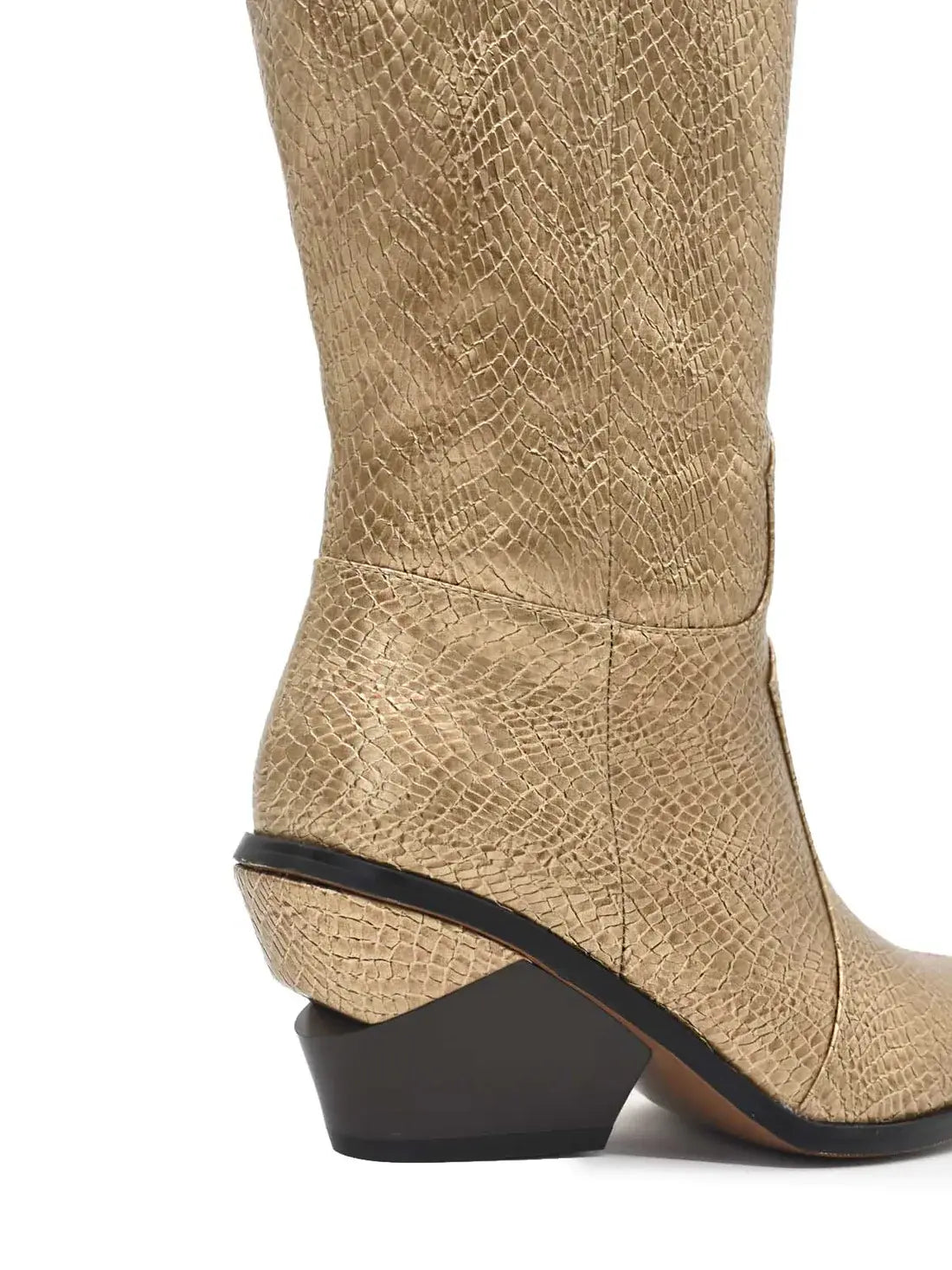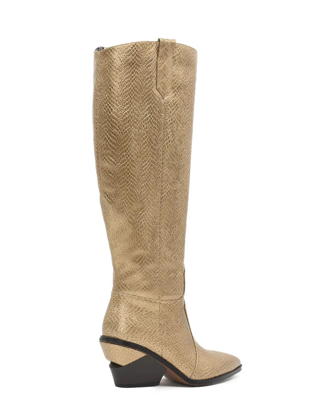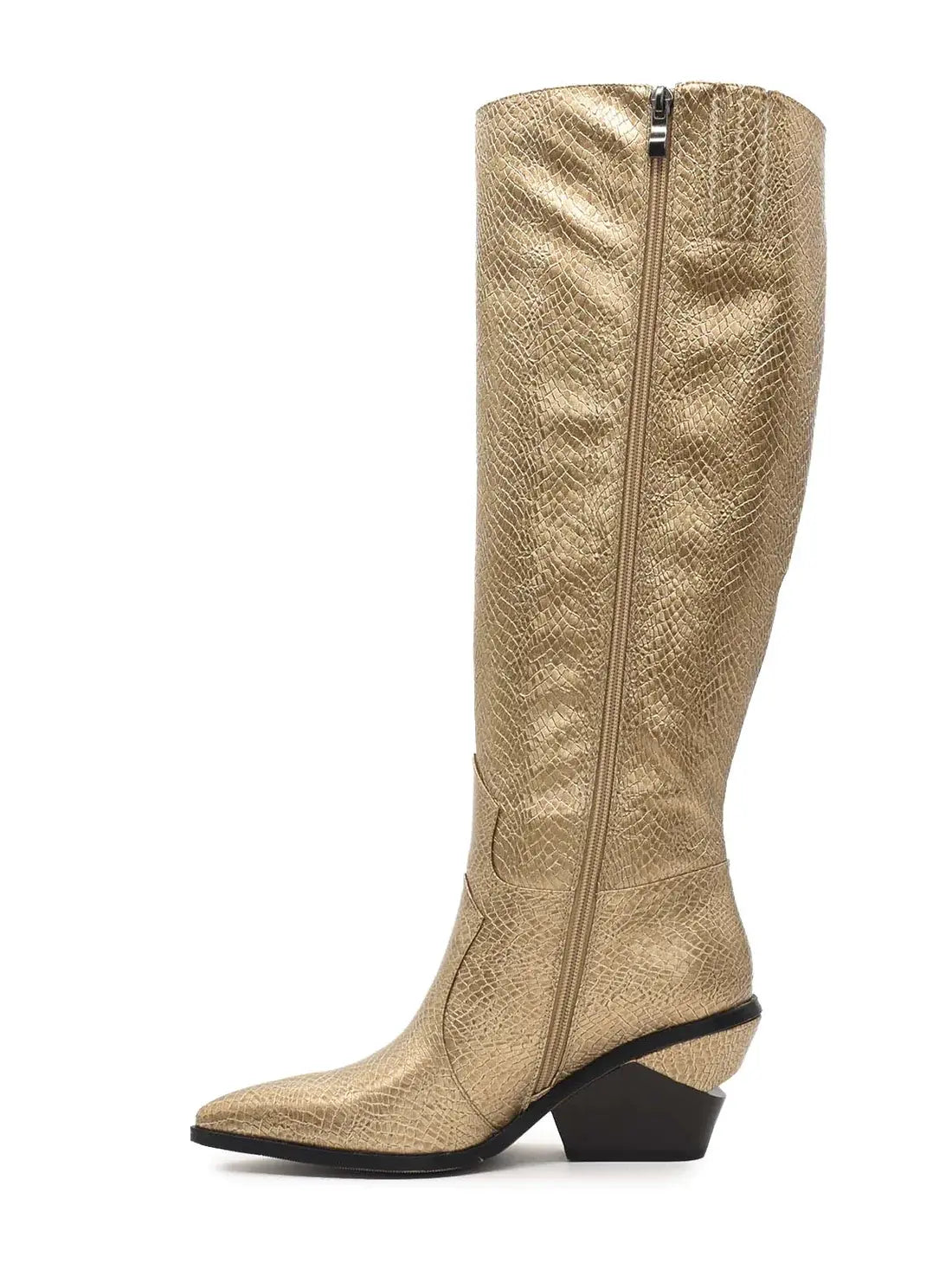 Ziehen Sie die Aufmerksamkeit auf sich mit diesen goldfarbenen Stiefeln mit Schlangendruck.