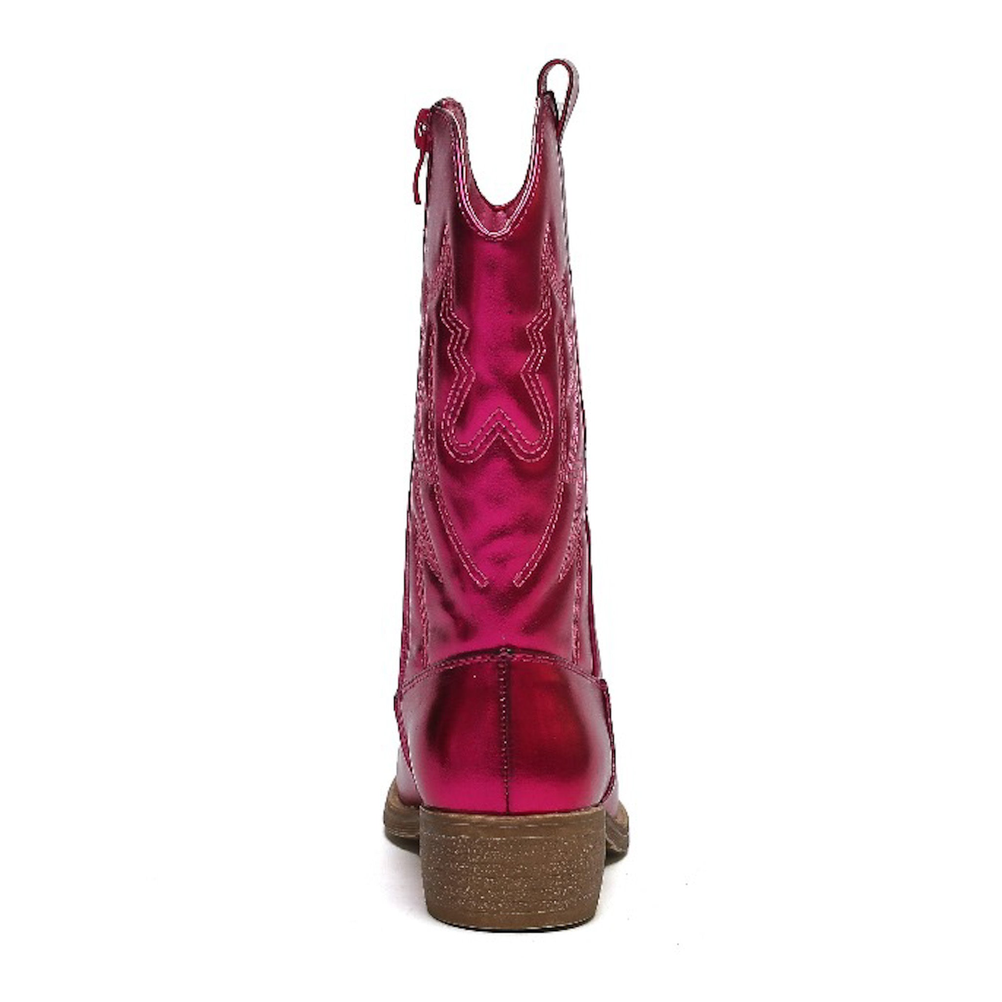 Robuste Cowboystiefel für Mädchen. Diese fuchsiafarbenen Metallic-Cowboystiefel für Kinder haben einen dezenten Absatz und einen einfachen Einstiegsreißverschluss.