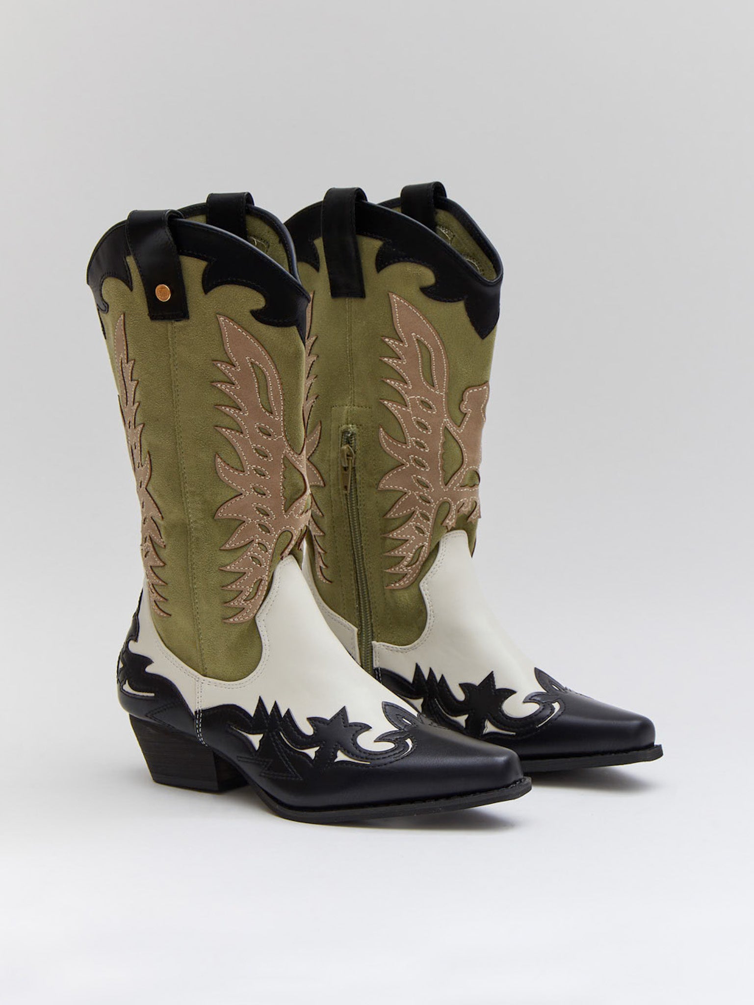 Cowboystiefel sind wieder da, und wie. Diese Cowboystiefel für Damen kombinieren die klassische Westernsilhouette mit verspielten Farben und auffälligen Nähten. Die spitze Schuhspitze, der schräge Absatz und der hohe Schaft machen dieses Paar zu einem echten Hingucker. Tragen Sie sie unter Jeans, Kleidern oder Röcken und Ihr Look ist sofort komplett. Sie geben selbst dem einfachsten Outfit einen witzigen Kick.