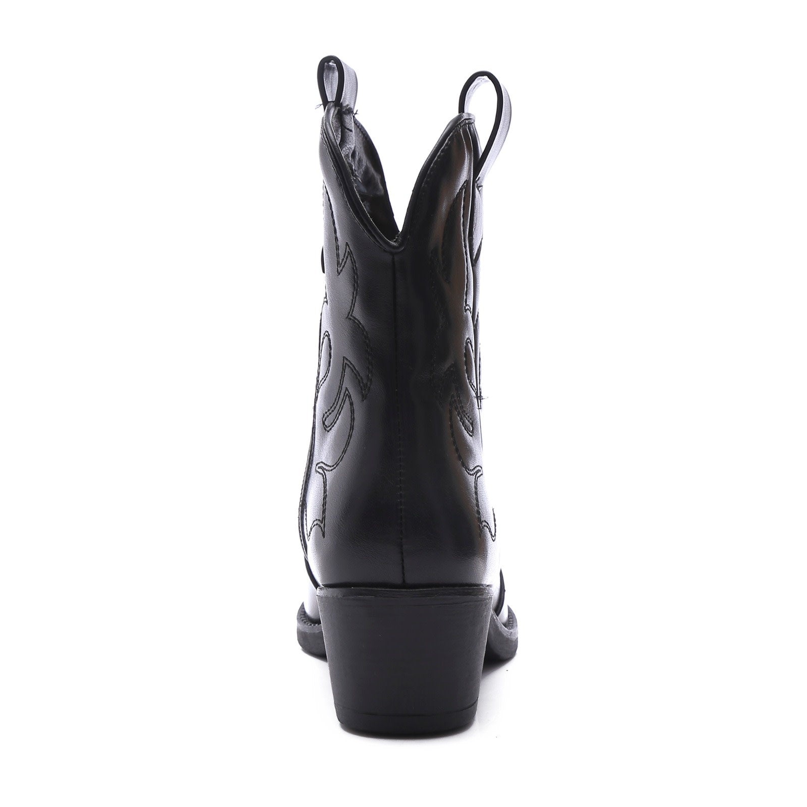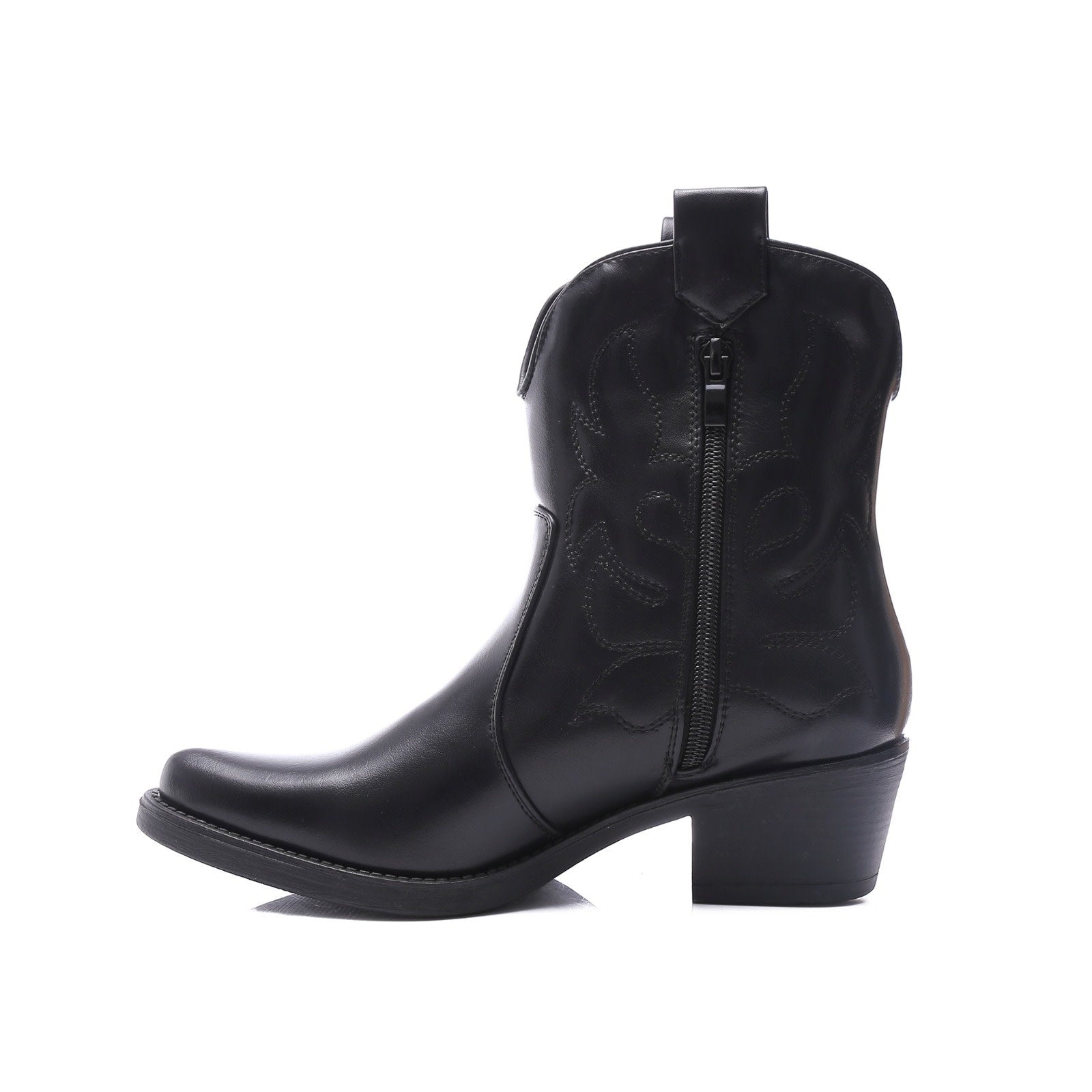 Schwarze kurze Cowboystiefel aus Lederimitat für Frauen. Abgenähte Stiefel mit schwarzer Sohle. Erhältlich in den Größen 36 bis 41. Einstiegsreißverschluss an der Innenseite.