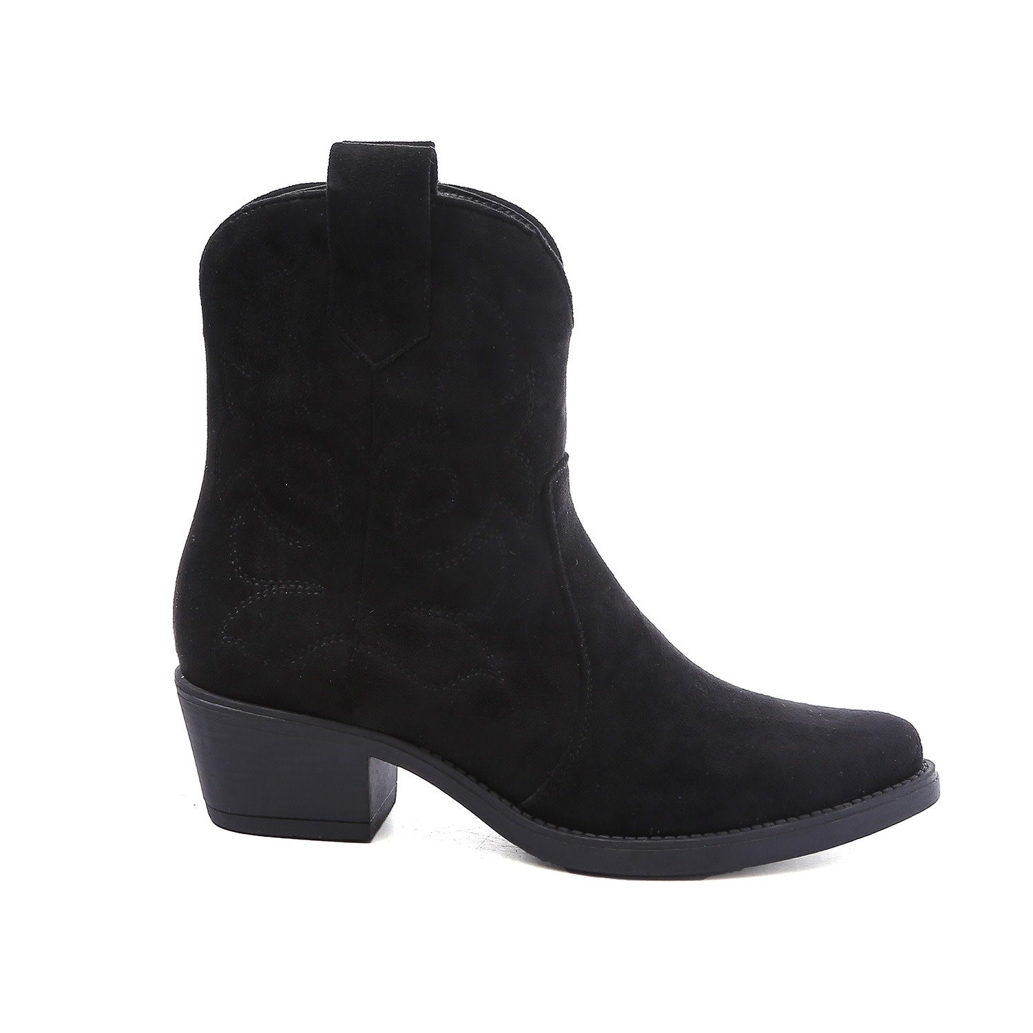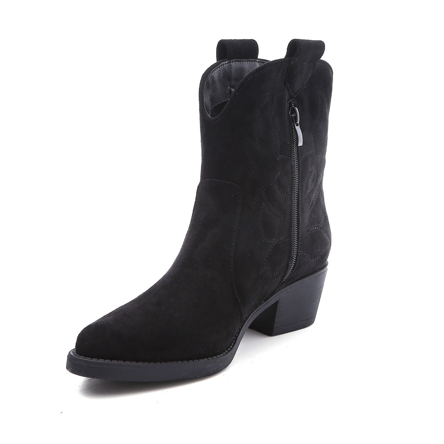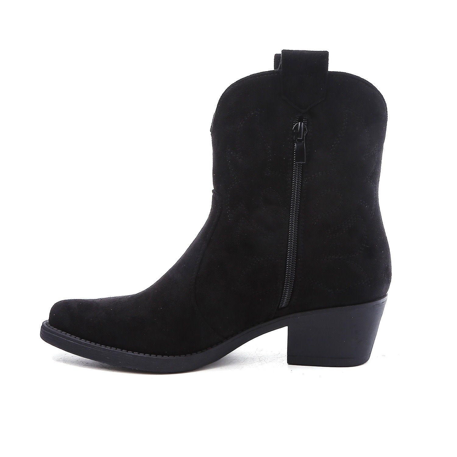 Schwarze, kurze Cowboystiefel aus Wildleder für Frauen. Abgenähte Stiefel mit schwarzer Sohle. Erhältlich in den Größen 36 bis 41. Einstiegsreißverschluss an der Innenseite.