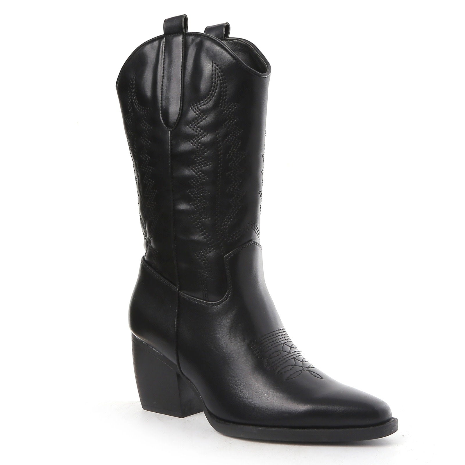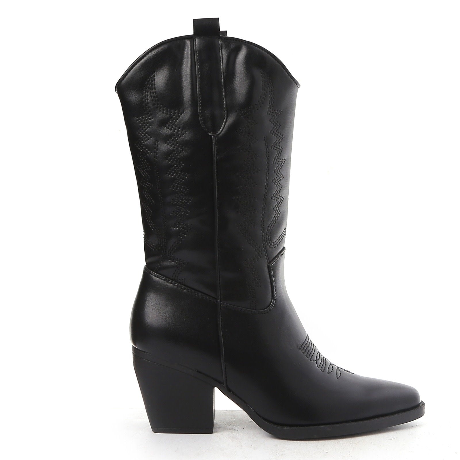 Schwarze Cowboystiefel aus Lederimitat für Frauen. Abgenähte Stiefel mit schwarzer Sohle. Erhältlich in den Größen 36 bis 41. Einstiegsreißverschluss an der Innenseite.