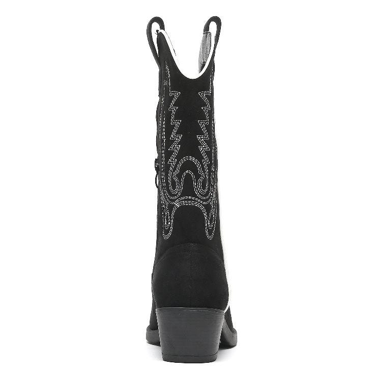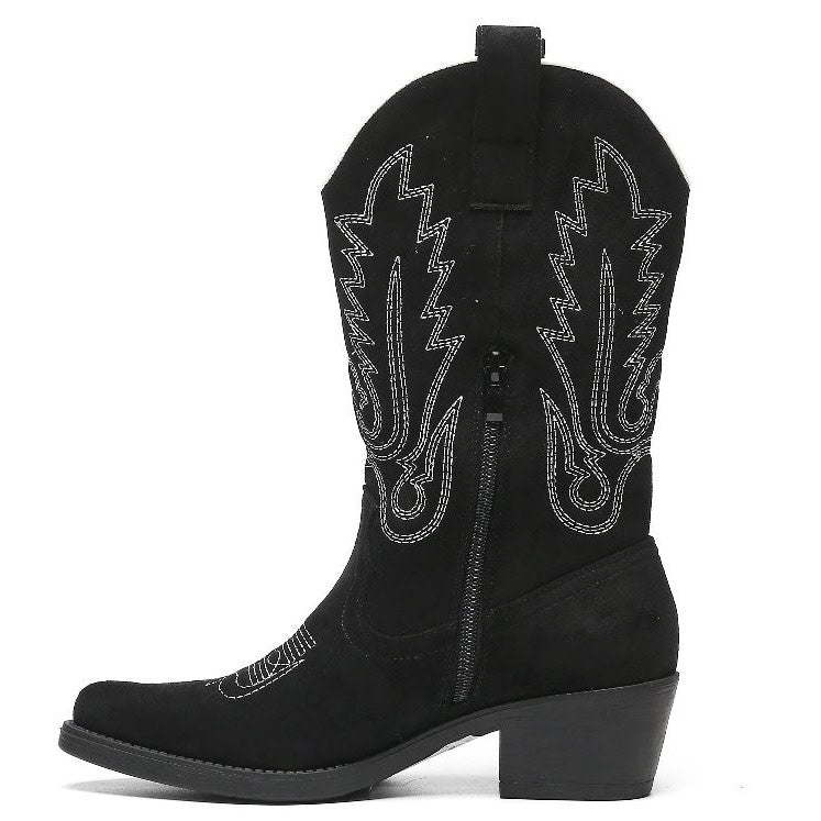 Verleihen Sie Ihrer Schuhsammlung einen Hauch von Westerncharme mit diesen tollen Cowboystiefeln aus schwarzem Veloursleder mit weißen Nähten. Bestellen Sie sie noch heute und gehen Sie mit Stil und Komfort!