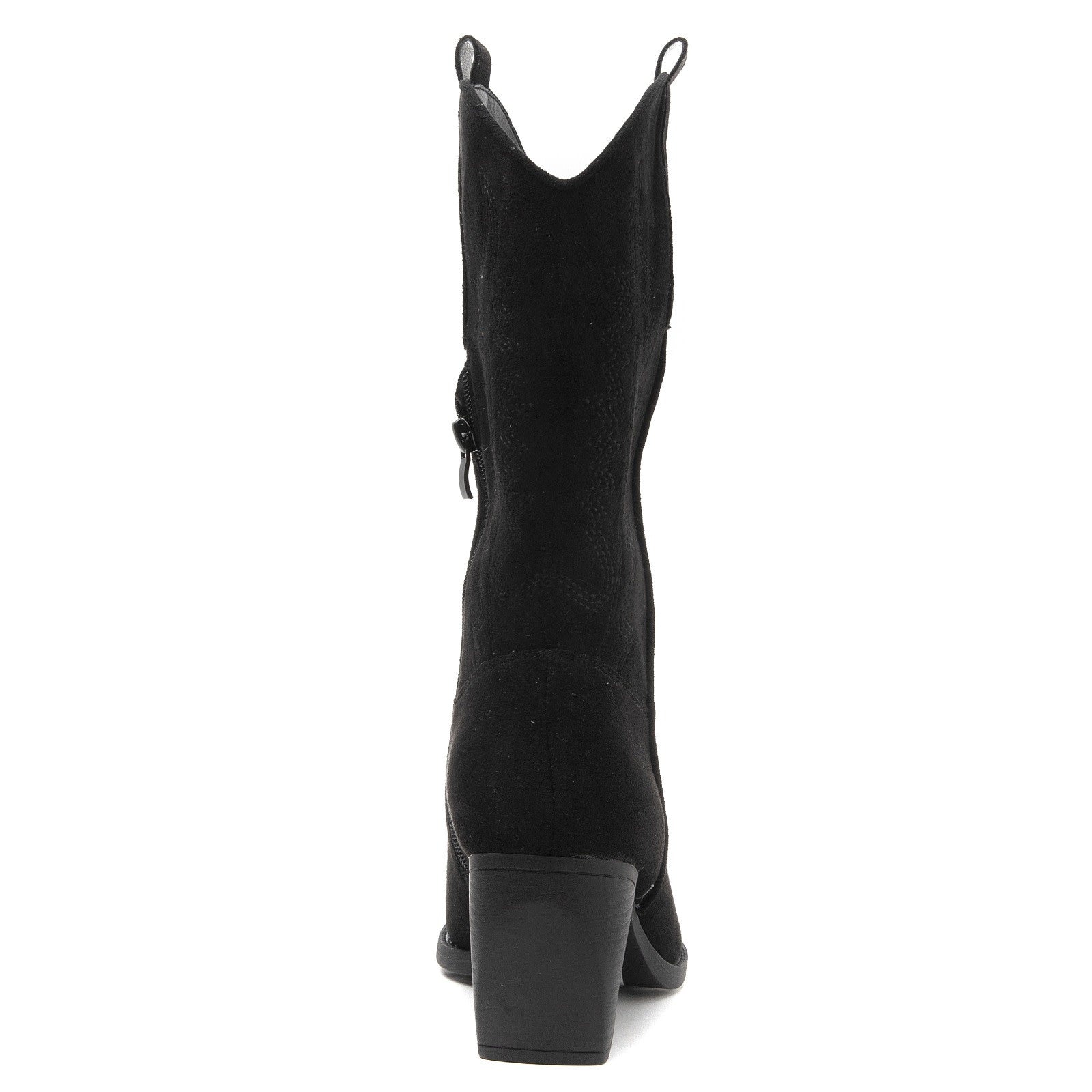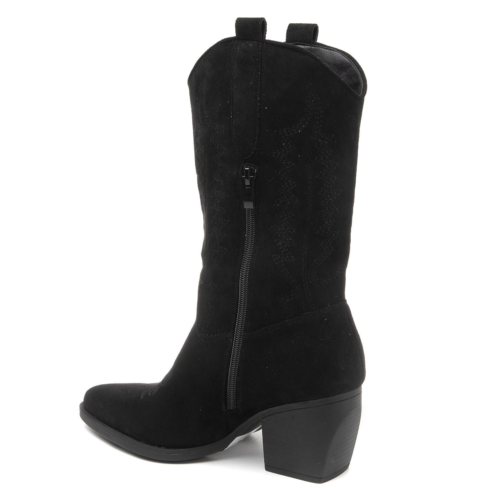 Schwarze Cowboystiefel aus Wildlederimitat für Damen. Stiefel mit Ziernähten und brauner Sohle. Erhältlich in den Größen 36 bis 41. Reißverschluss an der Innenseite. Mit diesen Westernstiefeln rundest du dein Outfit perfekt ab. Weiterlesen
