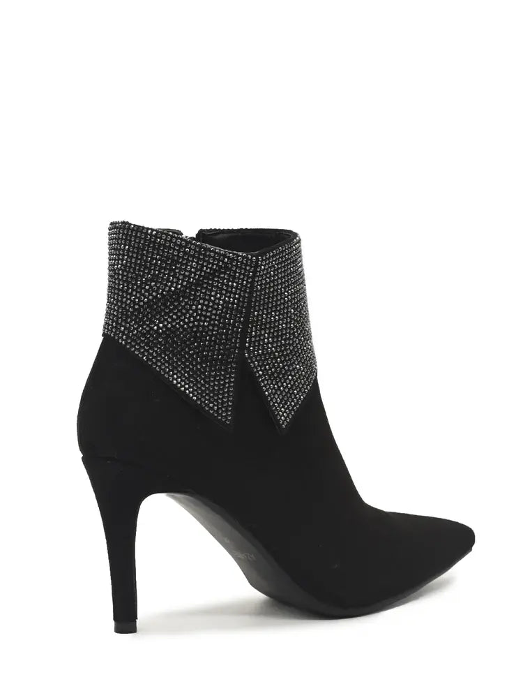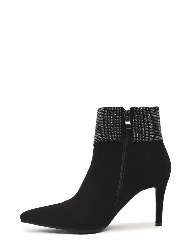 Schwarze Stiefelette aus Veloursleder mit Strassstein mit schwarzem Reißverschluss an der Innenseite, erhältlich von Größe 36 bis 41. Must-have Booties für die kommenden Feiertage