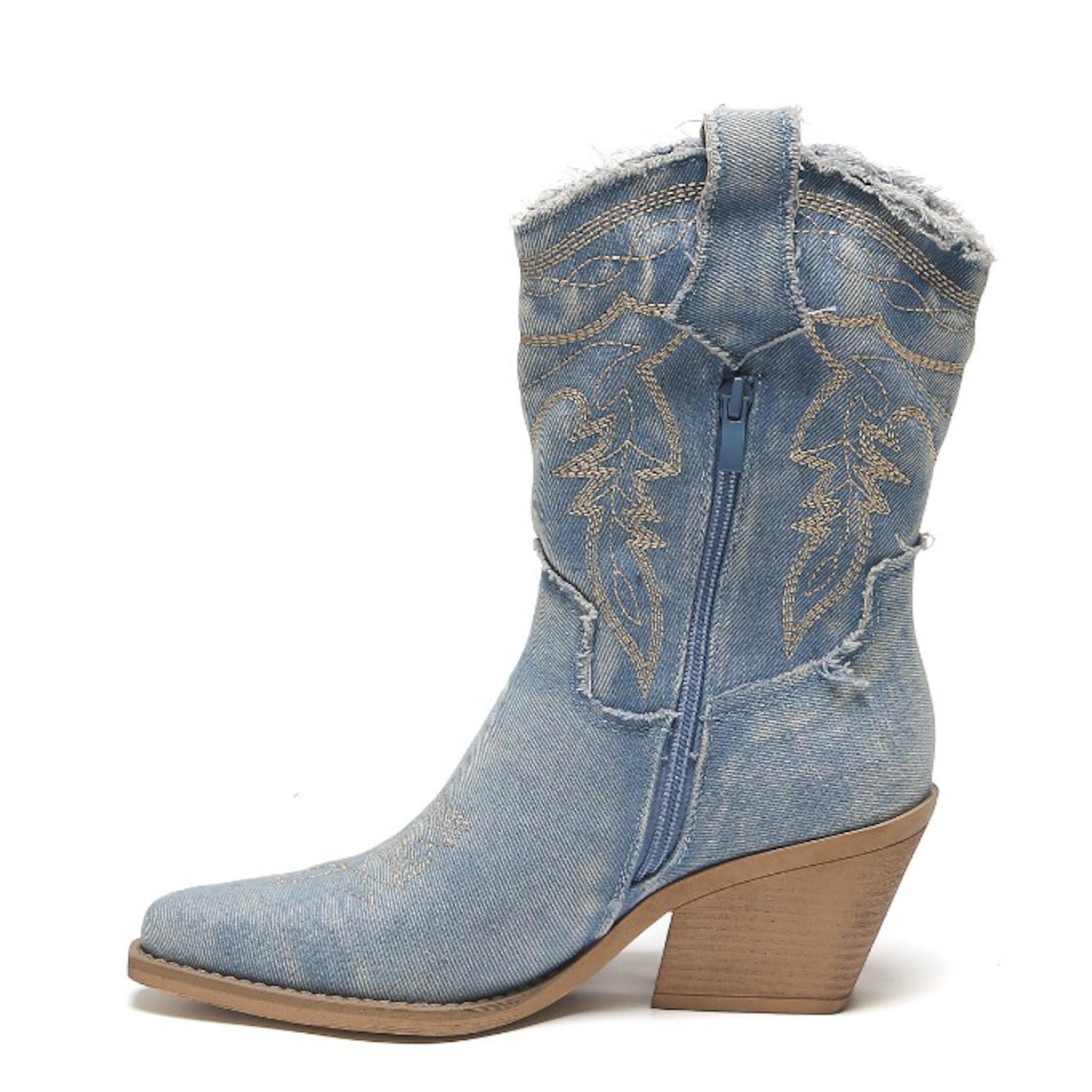 Gehen Sie stilvoll aus mit unseren neuen kurzen blauen Cowboystiefeln. Diese Must-Have-Cowboystiefel mit einzigartigem hellem Denim-Look und schönen Nähten sind perfekt für jede Gelegenheit, von lässig bis schick. Denim ist total angesagt! Bestellen Sie jetzt und lassen Sie Ihr Outfit strahlen!