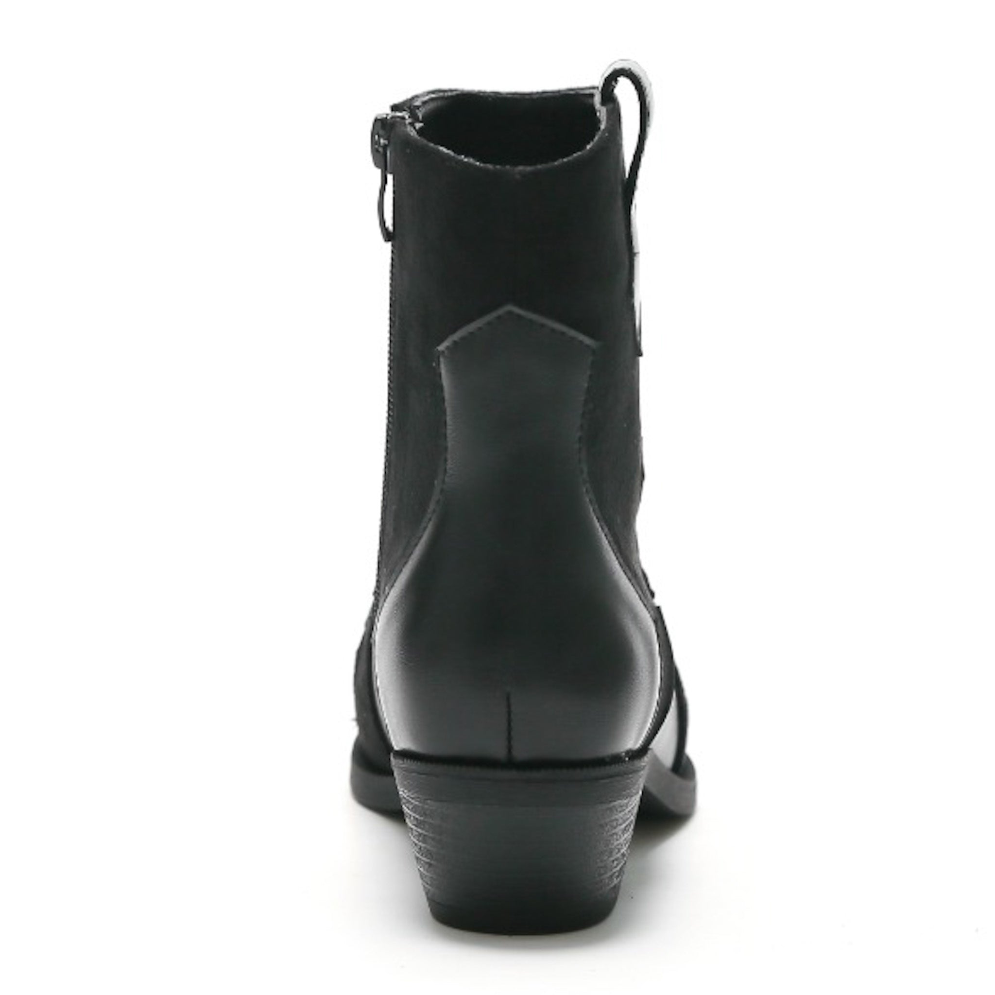 Kurze, schwarzfarbene Cowboystiefel mit Western-Details. Die Stiefel haben eine bequeme Passform, sind mit einem robusten 4 cm hohen Absatz versehen und verfügen über Einstiegsreißverschlüsse.