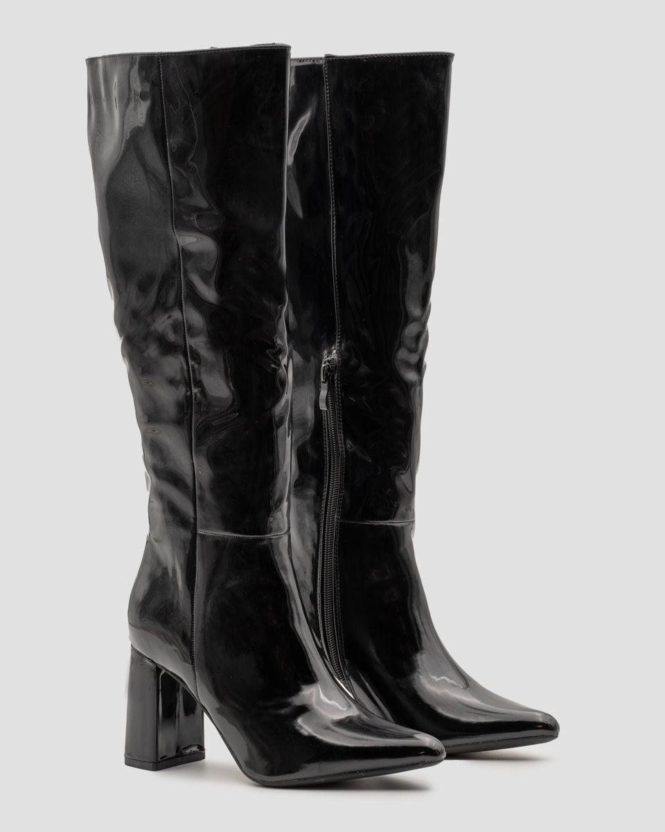 Stylische Lackstiefel schwarz. Perfekte Passform und leicht zu kombinieren. Erhältlich in den Größen 36 bis 41. Ausgestattet mit kurzem Reißverschluss auf der Innenseite. Passt größengetreu.