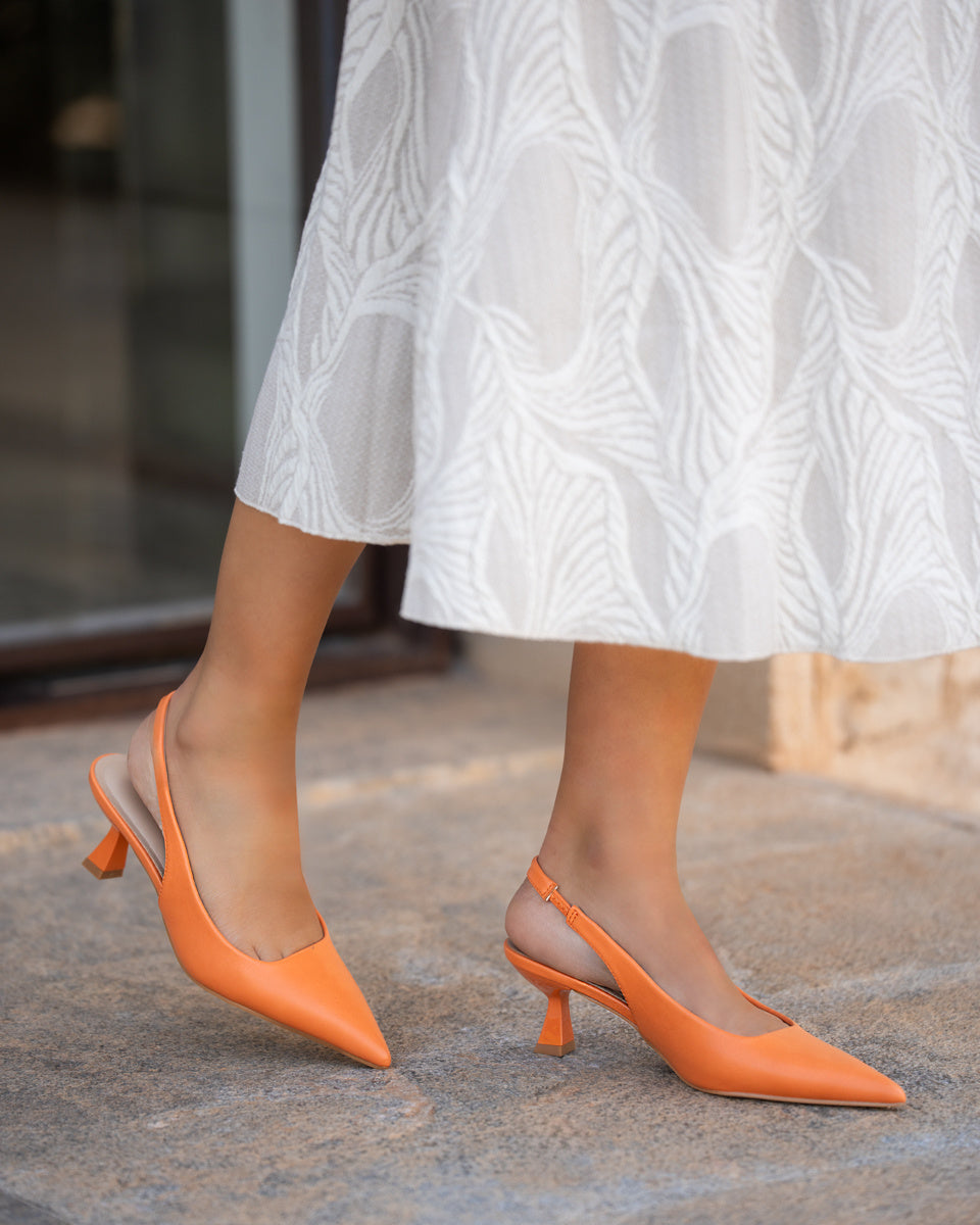 Elegante orangefarbene Slingback Heels, perfekt für jede Fashionista. Diese Pumps mit perfekter Passform bieten einen raffinierten Look, während der schmale Absatz Ihnen einen subtilen Auftrieb verleiht. Ideal für formelle und legere Anlässe.