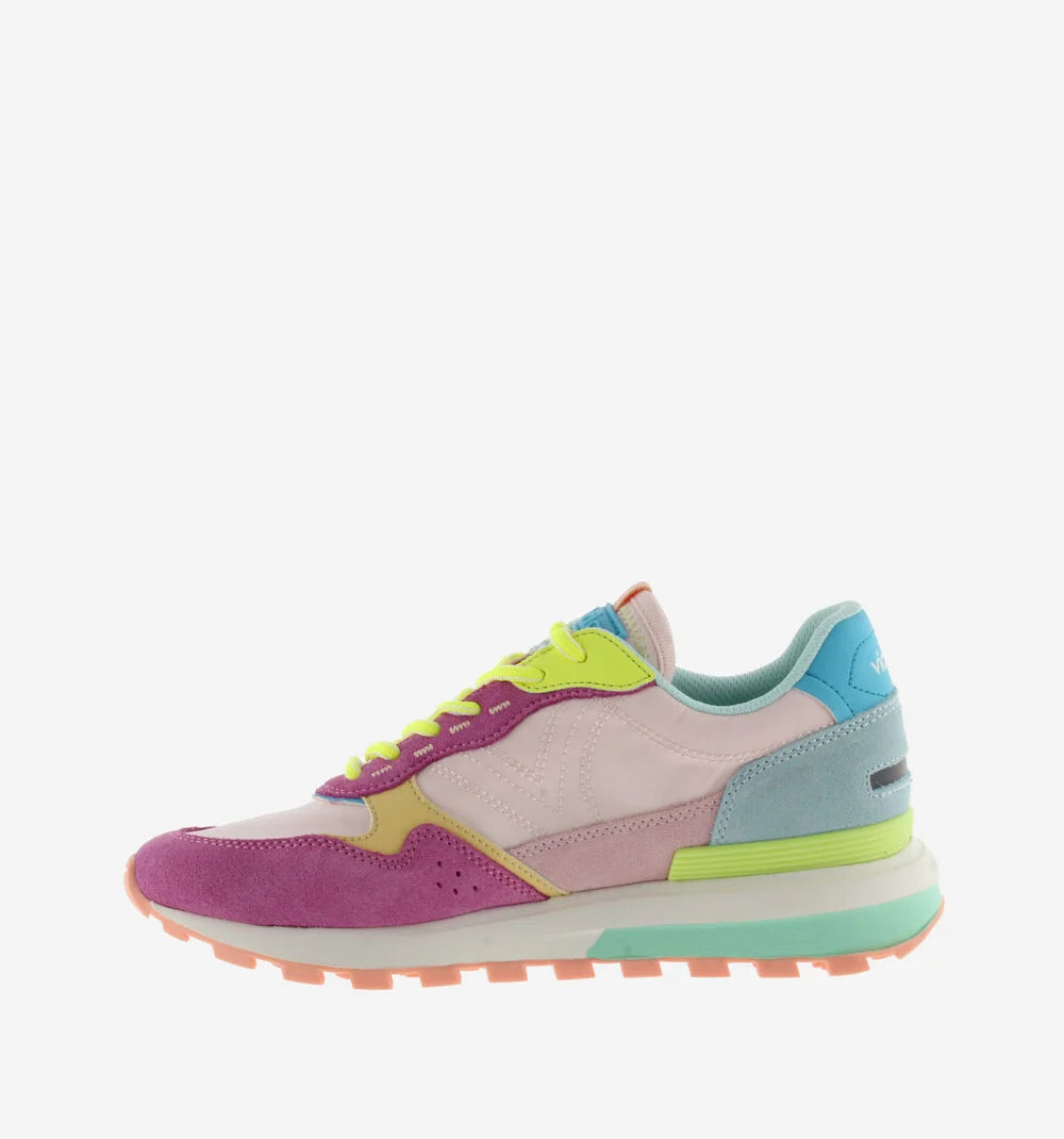 Verleihen Sie Ihrem Outfit einen auffälligen und modischen Touch mit den Luna Nylon Multicolour Rosa Turnschuhen von Victoria. Diese farbigen Damenturnschuhe kombinieren auf subtile Weise verschiedene sanfte Farbtöne wie Rosa, Lila und Beige und kreieren einen verspielten und doch raffinierten Look. Dank der Verwendung von Nylon und Spaltleder aus Wildleder wirken die Turnschuhe leicht und feminin, ideal für jede Jahreszeit.