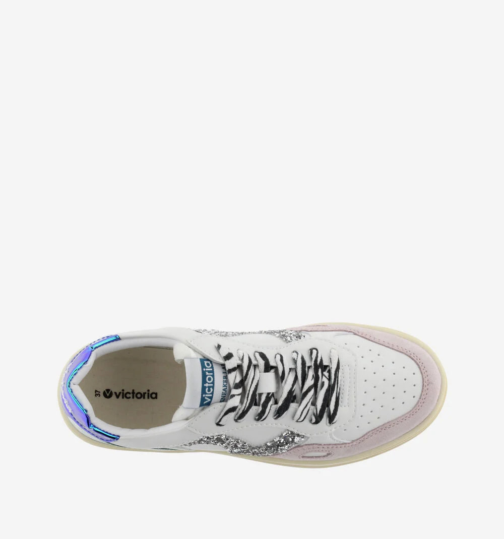 Diese weißen Damenturnschuhe mit Glitzer- und Zebra-Akzenten sind überraschend vielseitig. Kombinieren Sie sie mit Jeans, Midiröcken oder Oversize-Blazern für einen urbanen Look mit Flair. Lassen Sie Ihren persönlichen Stil für sich sprechen mit diesen unverwechselbaren Victoria-Turnschuhen - für Frauen, die sich trauen, aufzufallen.