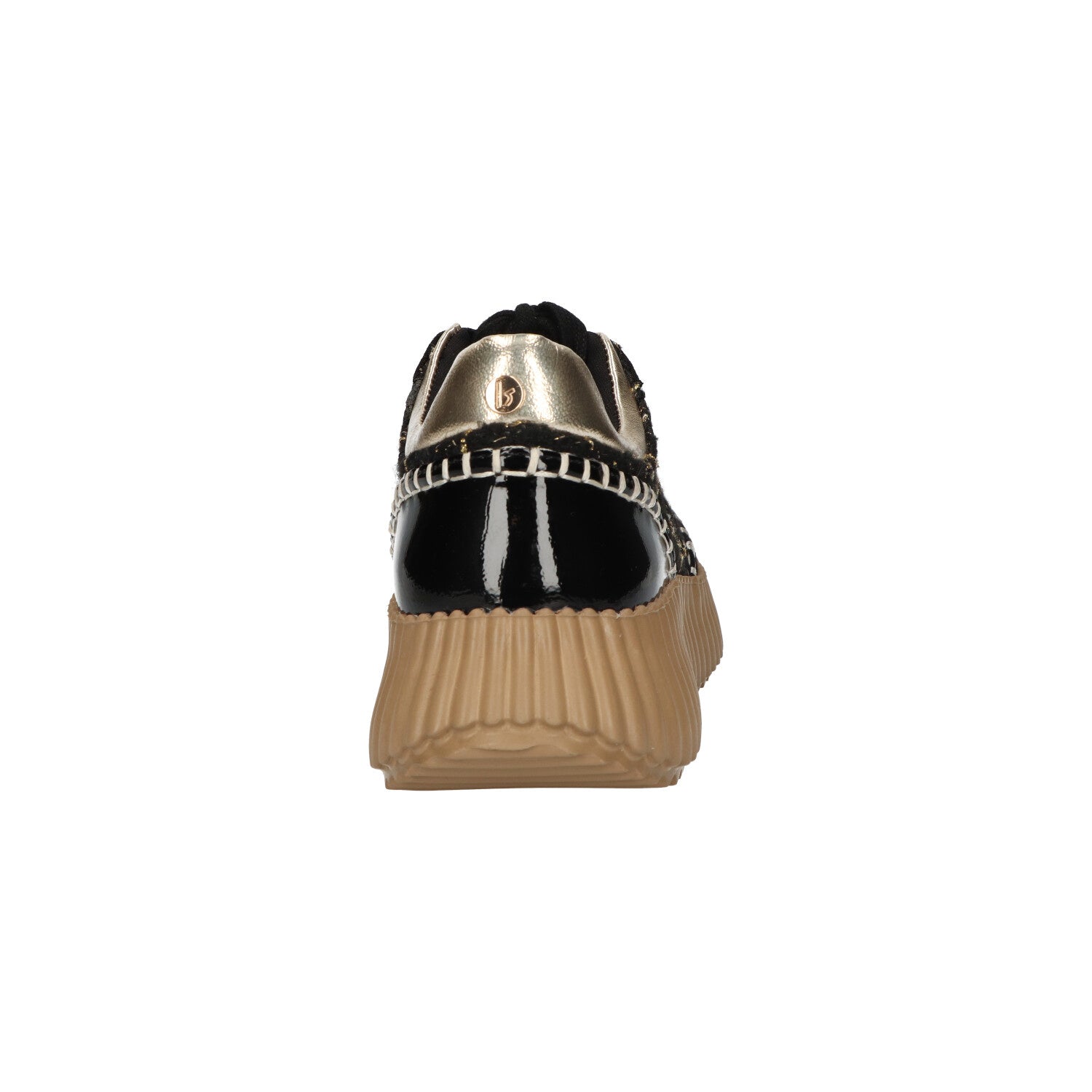 Entscheiden Sie sich für coole schwarze La strada Turnschuhe mit goldenen Canvas-Patches und Nähten. Bequeme Turnschuhe mit perfekter Passform. Kunstleder Turnschuhe mit stabiler Sohle sorgt für guten Grip.
