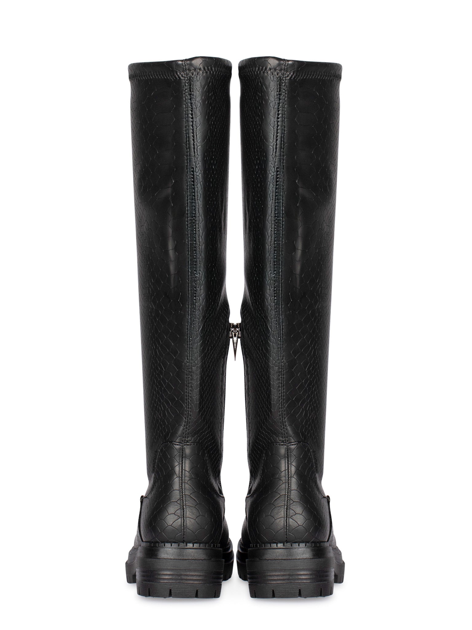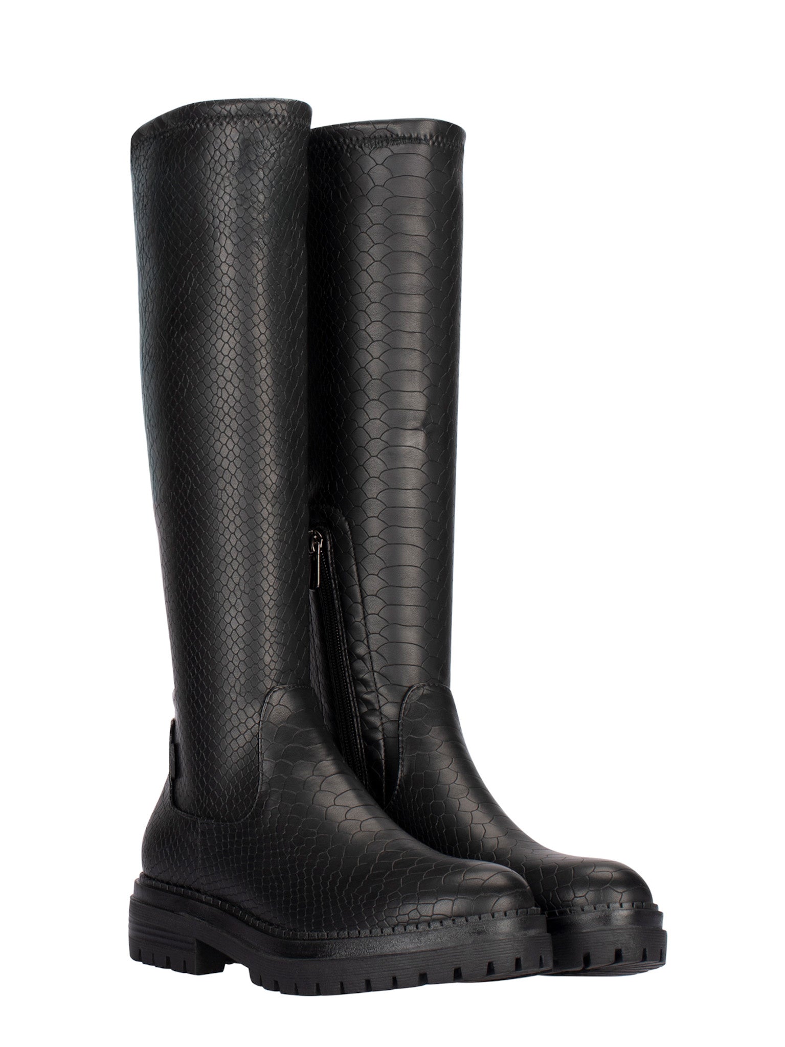 Diese hohen schwarzen Damenstiefel sind aus Kunstleder mit zarter Schlangenstruktur gefertigt. Ein subtiles Detail, das für das gewisse Extra an Luxus und Charakter sorgt. Die robuste Sohle mit Profil setzt nicht nur einen coolen Akzent, sondern bietet auch zusätzlichen Halt in den kälteren Monaten. Kombinieren Sie diese schwarzen Damenstiefel mit einem übergroßen Pullover oder Trenchcoat für einen modernen Look mit Schwung.