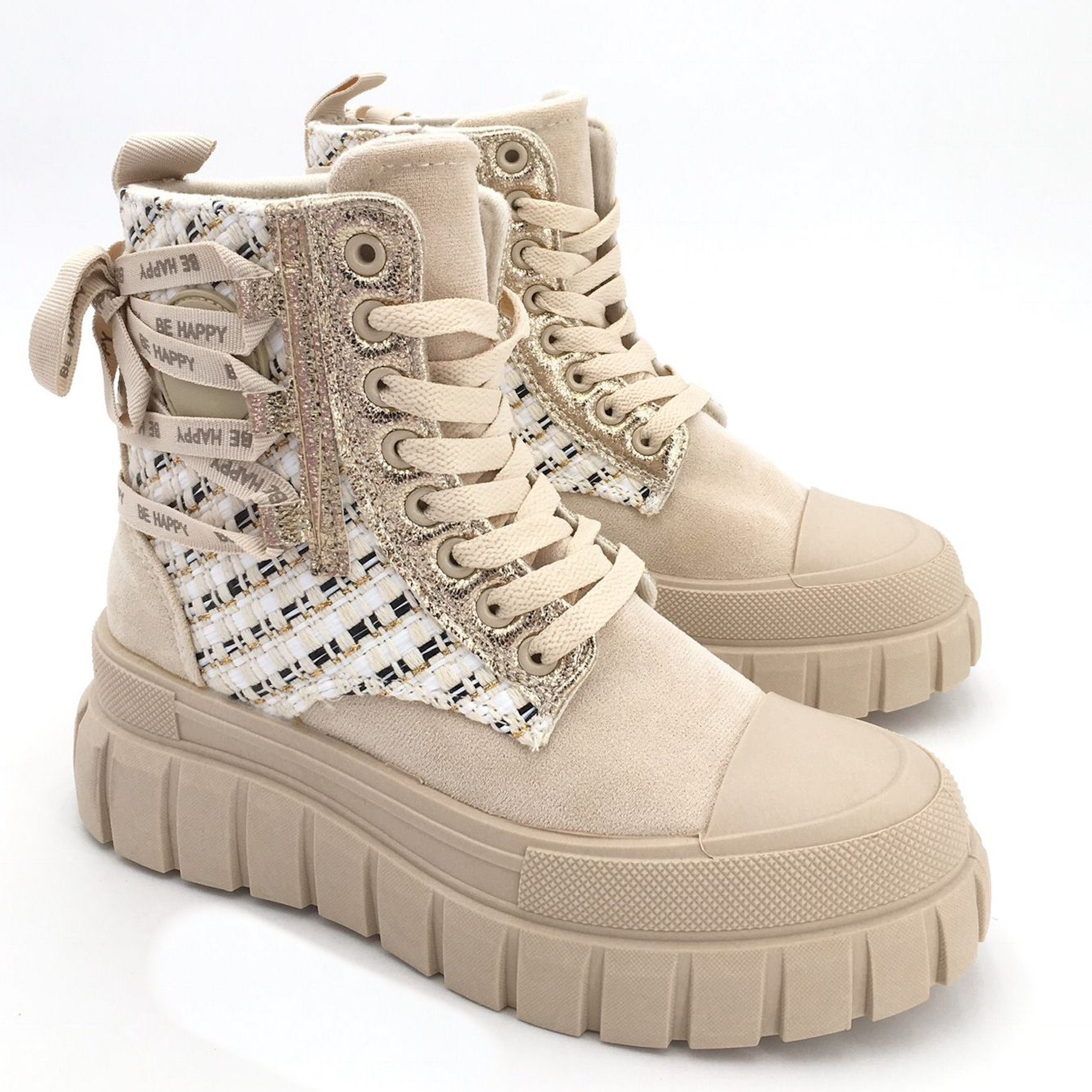 Trendige beige Schnürstiefel mit Canvas-Details. Diese Schnürschuhe aus Wildlederimitat sind mit trendigen Canvas- und goldfarbenen Metallic-Details verziert. Erhältlich in den Größen 36 bis 41.Weiterlesen