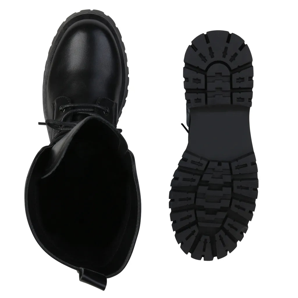 Gehen Sie stilvoll durch den Tag mit unseren schwarzen Schnürstiefeln! Trendiges Design in Lederoptik sorgt für einen coolen Look. Jetzt bestellen und selbstbewusst strahlen!