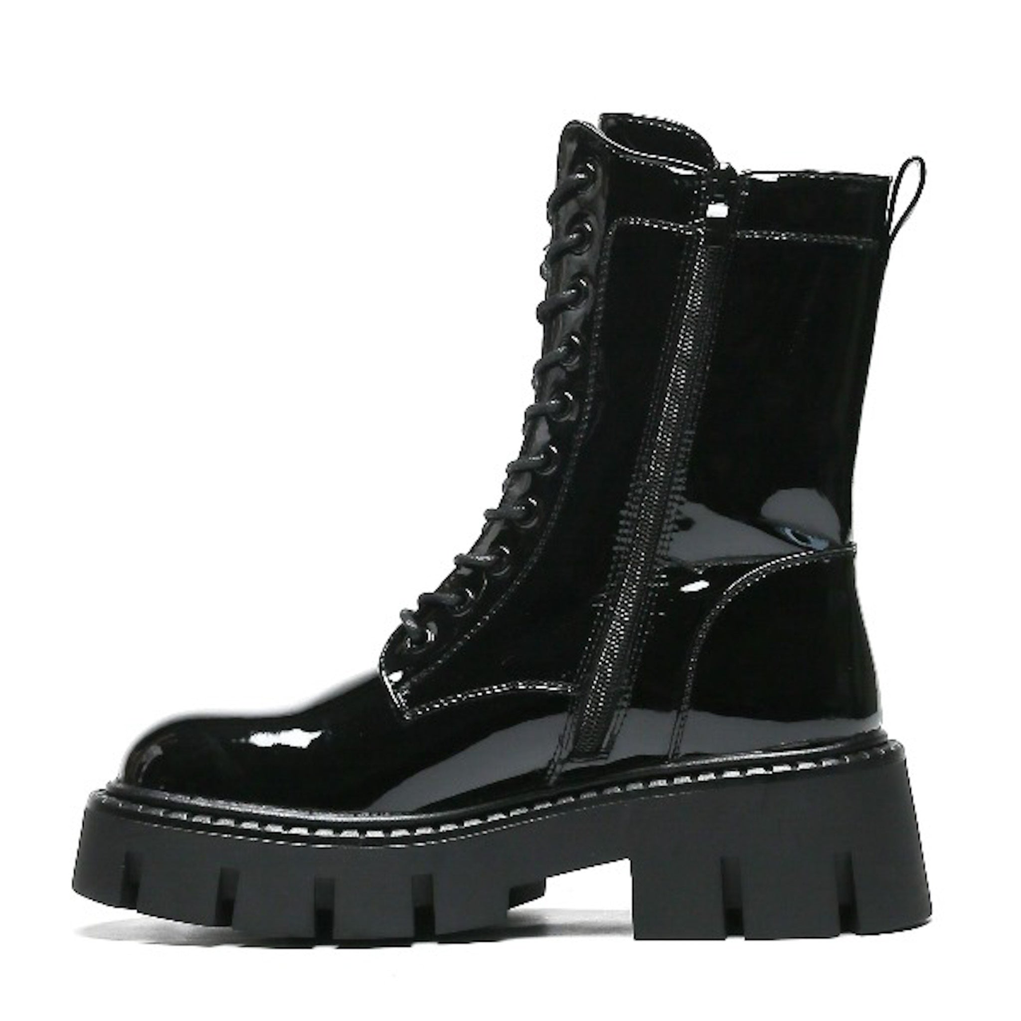 Entdecken Sie diese stylischen schwarzen Schnürstiefel! Diese bequemen Schnürschuhe mit cooler Schnalle sind perfekt für jede Gelegenheit. Mit ihrem einzigartigen Design und der robusten Plateausohle ziehen sie garantiert alle Blicke auf sich.