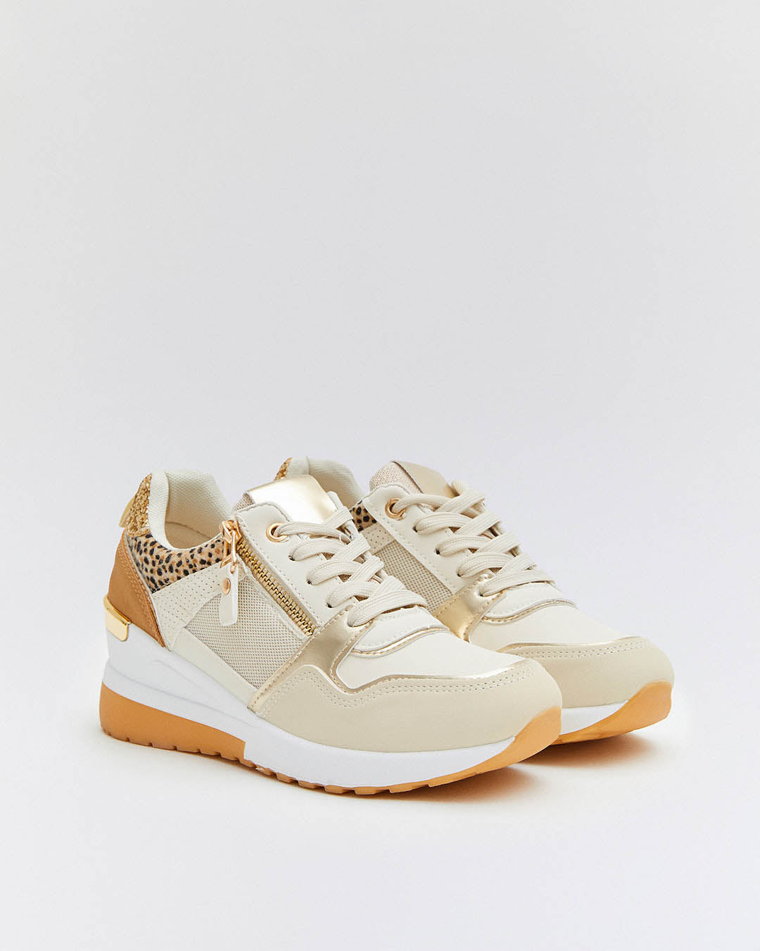 Wedge Sneakers Beige Zip Gold Leopard