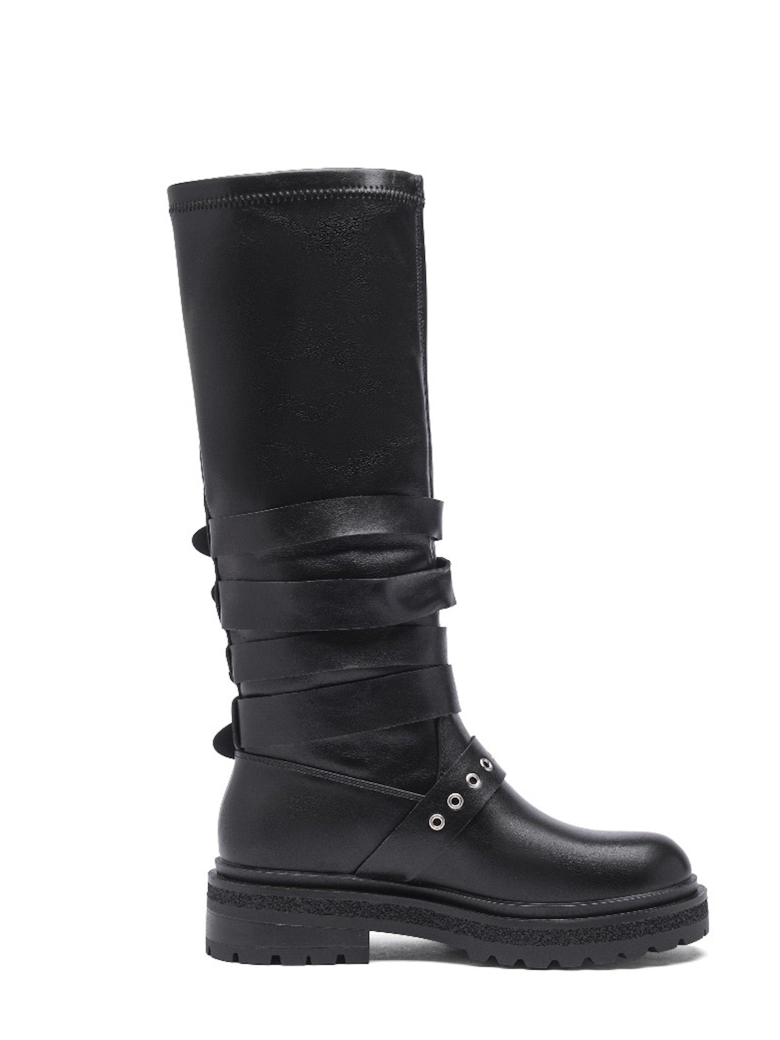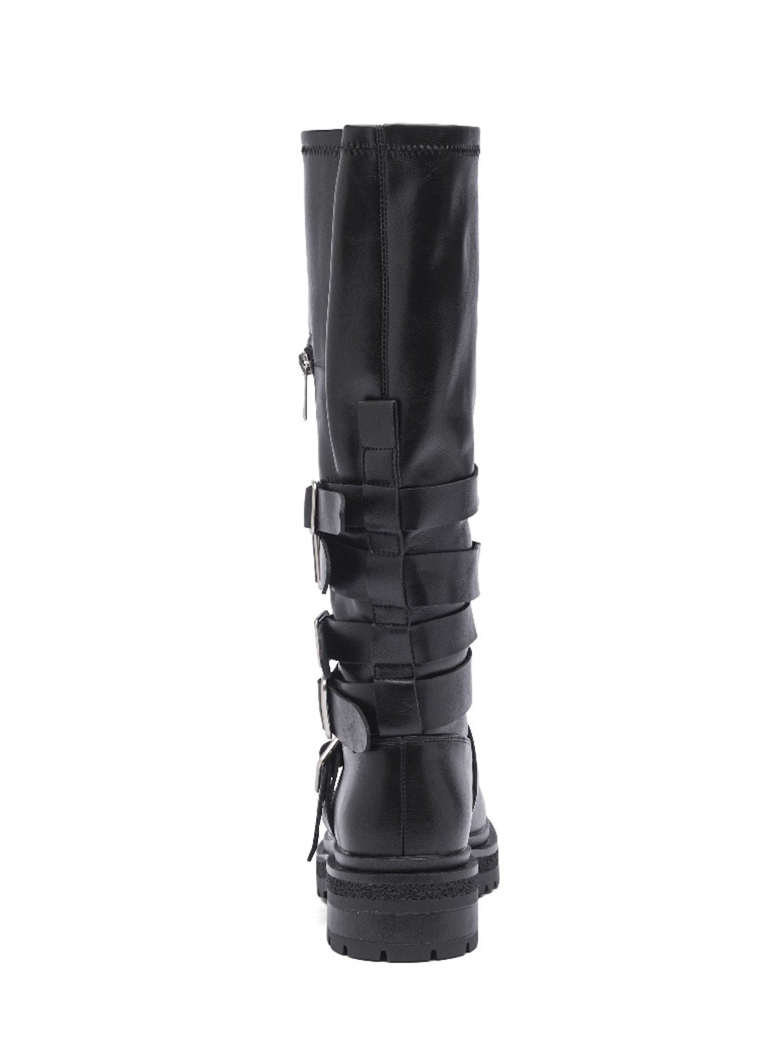 Diese hohen Biker-Boots sind aus hochwertigem Lederimitat gefertigt, das sich sanft mit dem Fuß bewegt, aber dennoch robust genug ist, um seine Form zu behalten. Der Reißverschluss an der Innenseite ermöglicht einen leichten Einstieg, während die dekorativen Schnallen mit silberfarbenen Details dem Stiefel einen coolen Twist verleihen. Der 4 cm hohe Blockabsatz bietet Stabilität und einen dezenten Auftrieb, perfekt für den Alltag.
